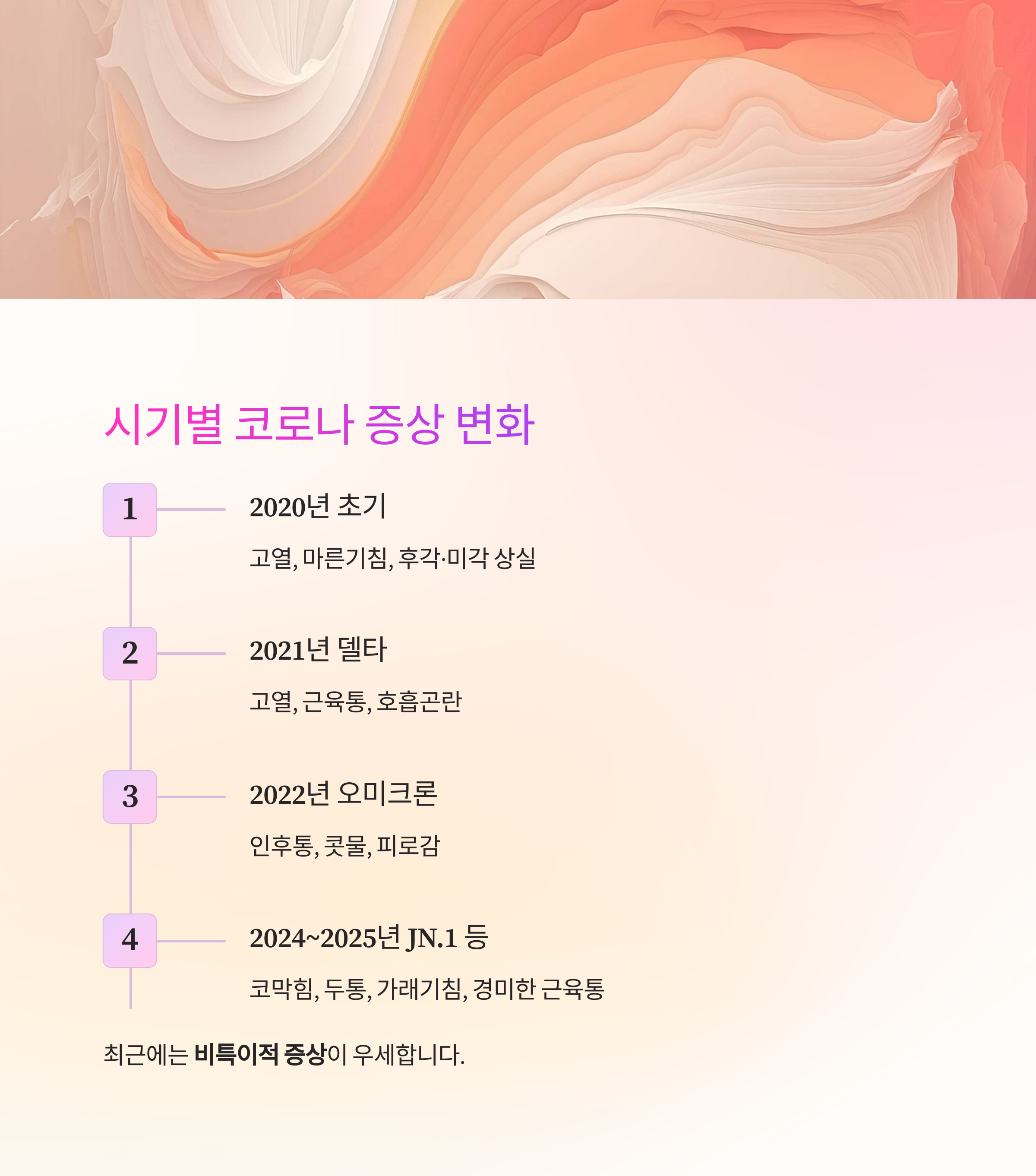 | 2024~2025년 | JN.1 등 후속 변이 | 코막힘, 두통, 가래기침, 경미한 근육통 |