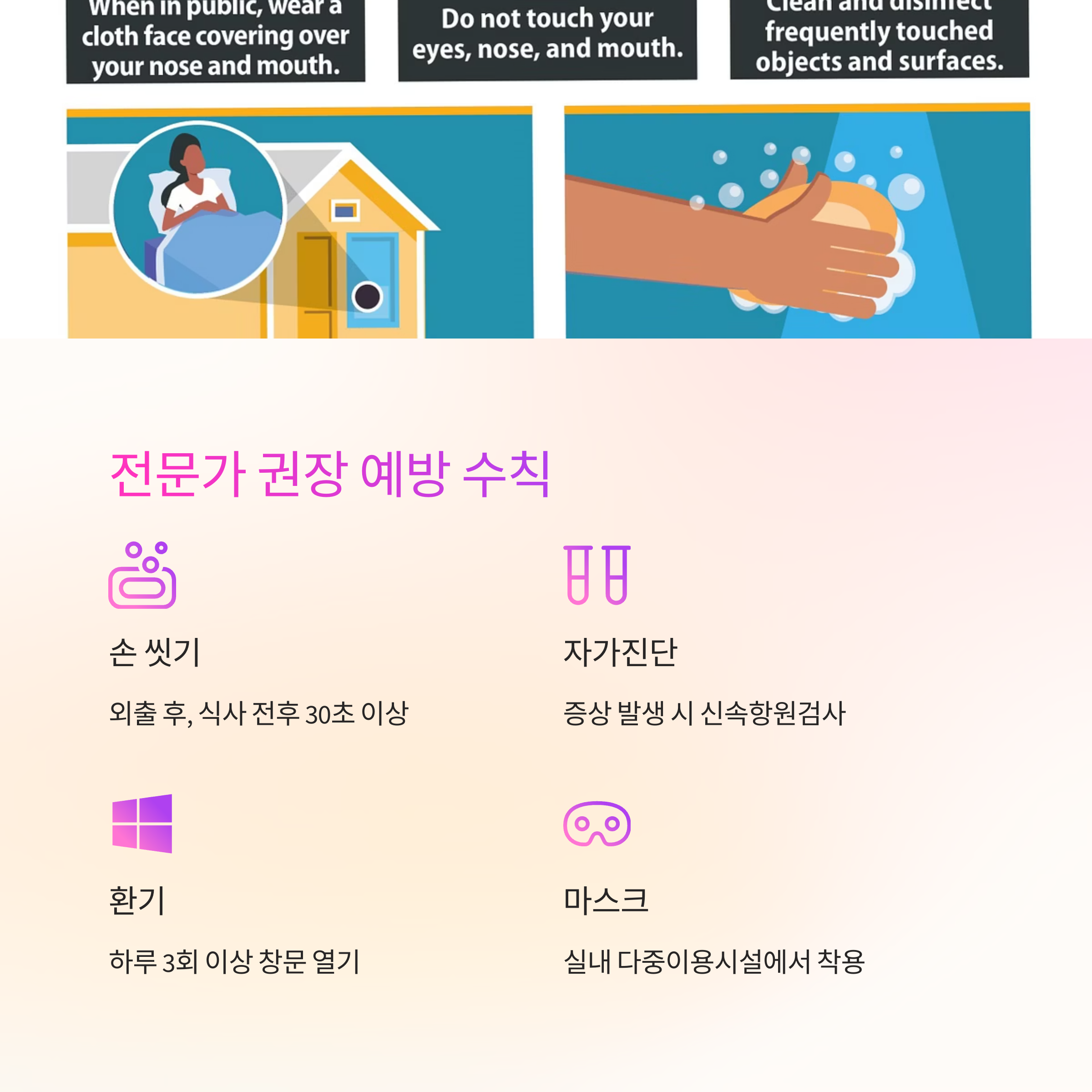 | 손 씻기 | 외출 후, 식사 전후 30초 이상 비누 사용 |