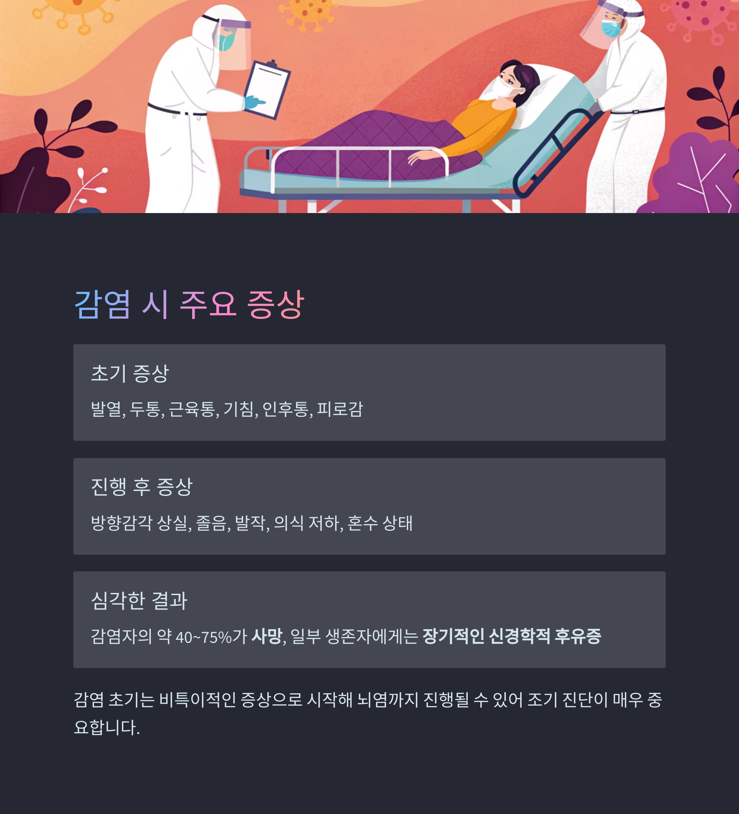 중요: 감염자의 약 40~75%가 사망에 이를 수 있으며, 일부 생존자에게는 장기적인 신경학적 후유증이 남습니다.