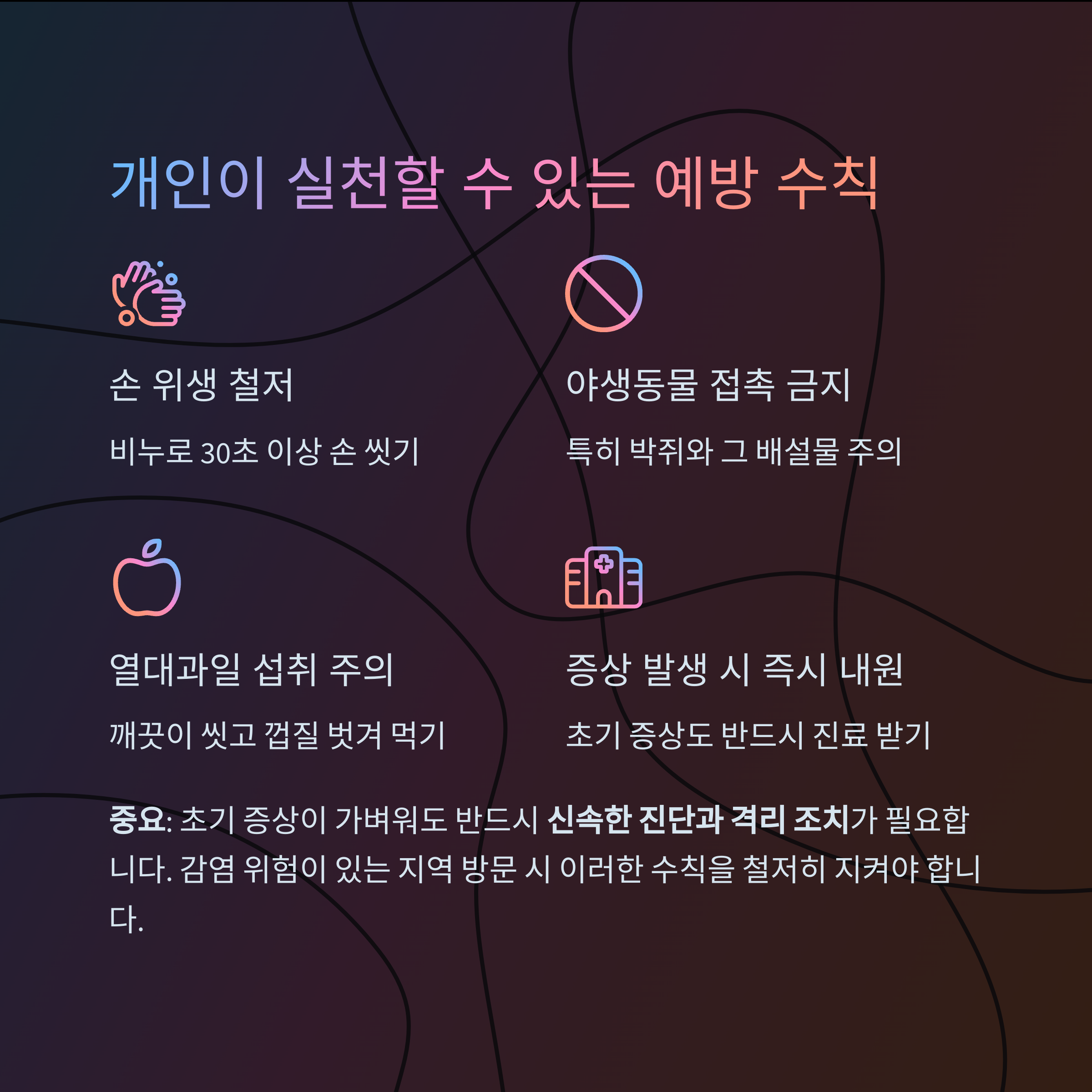 "손 위생 철저", "야생동물 및 동물 분비물 접촉 금지", "열대과일 섭취 시 주의",