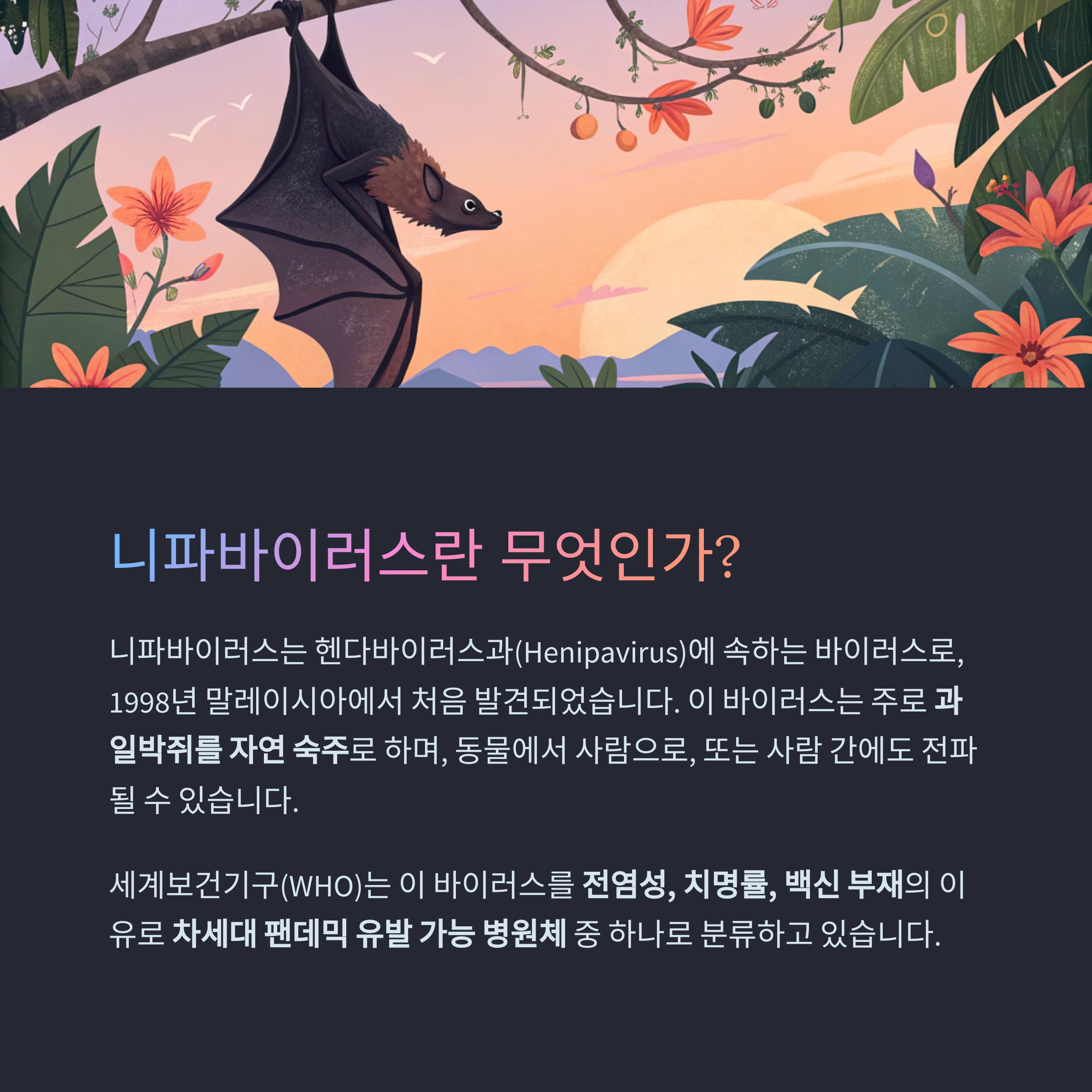 니파바이러스는 박쥐에서 유래한 고위험 인수공통감염병으로, 사람 간 전파도 가능한 점에서 특히 주의가 필요합니다. 감염 시 치명률이 매우 높고, 현재까지도 백신이나 특효약이 없기 때문에 초기 대응과 예방이 무엇보다 중요합니다. 본 글에서는 니파바이러스의 증상, 감염 경로, 확산 사례, 그리고 개인 및 사회적 대응 방안에 대해 체계적으로 정리하였습니다.