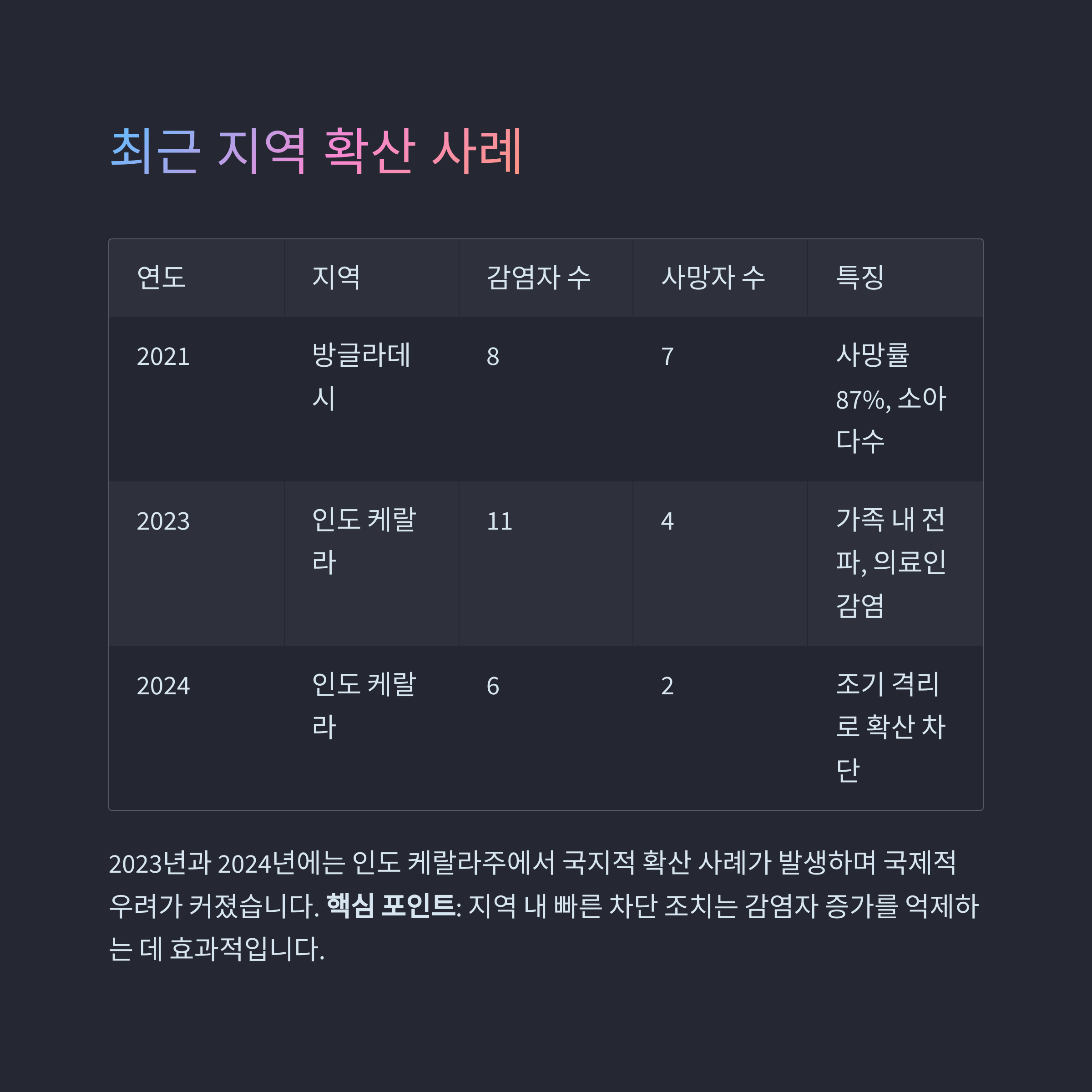 2023년과 2024년에는 인도 케랄라주에서 국지적 확산 사례가 발생하며 국제적 우려가 커졌습니다.