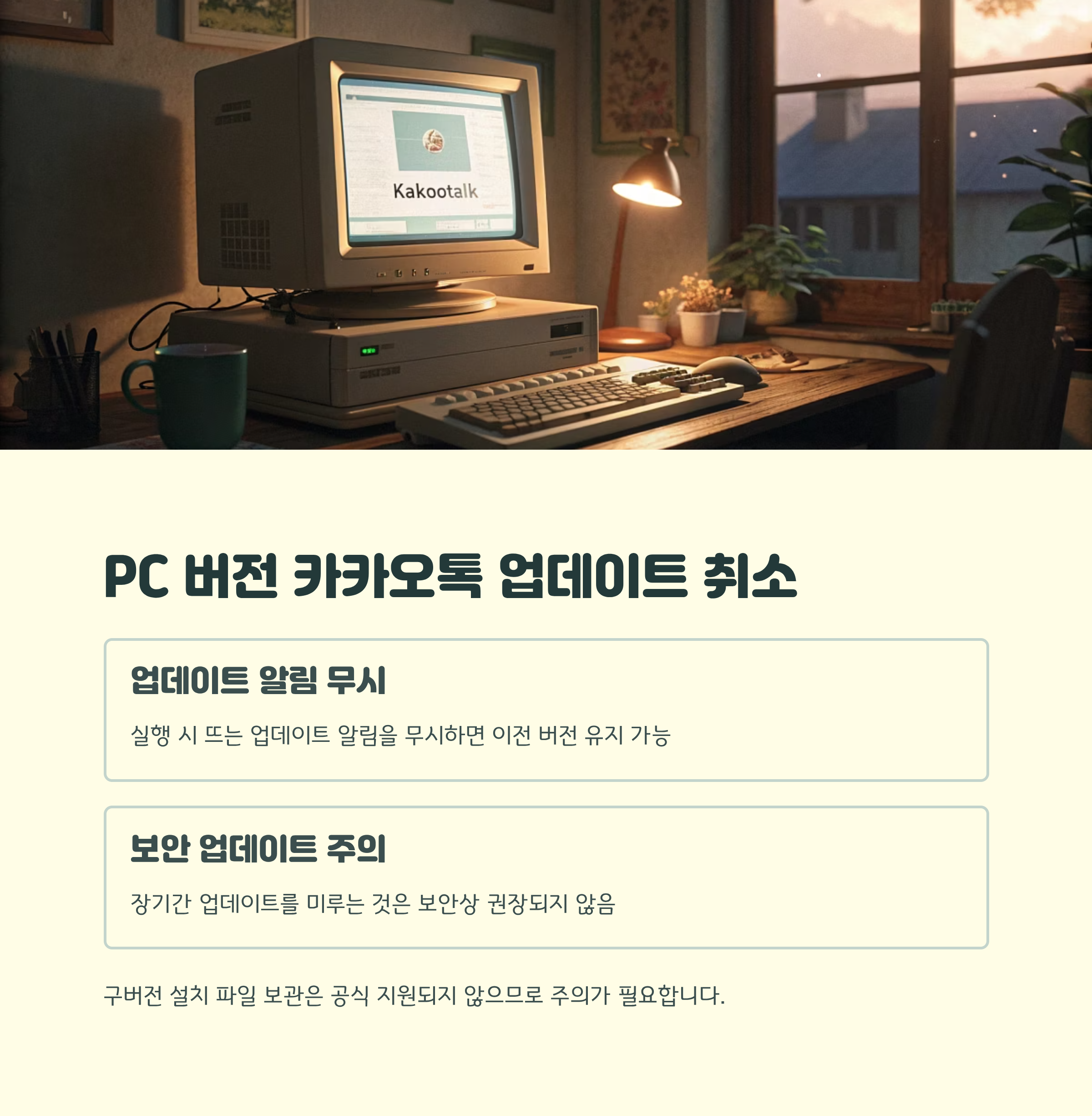PC 버전은 실행 시 자동으로 업데이트 알림이 뜨는데, 이를 무시하면 이전 버전을 유지할 수 있습니다. 다만 보안 업데이트가 포함되어 있을 수 있으므로 장기간 업데이트를 미루는 것은 권장되지 않습니다. 일부 사용자는 구버전 설치 파일을 따로 보관해 사용하기도 하지만, 공식적으로 지원되지 않기 때문에 주의가 필요합니다.