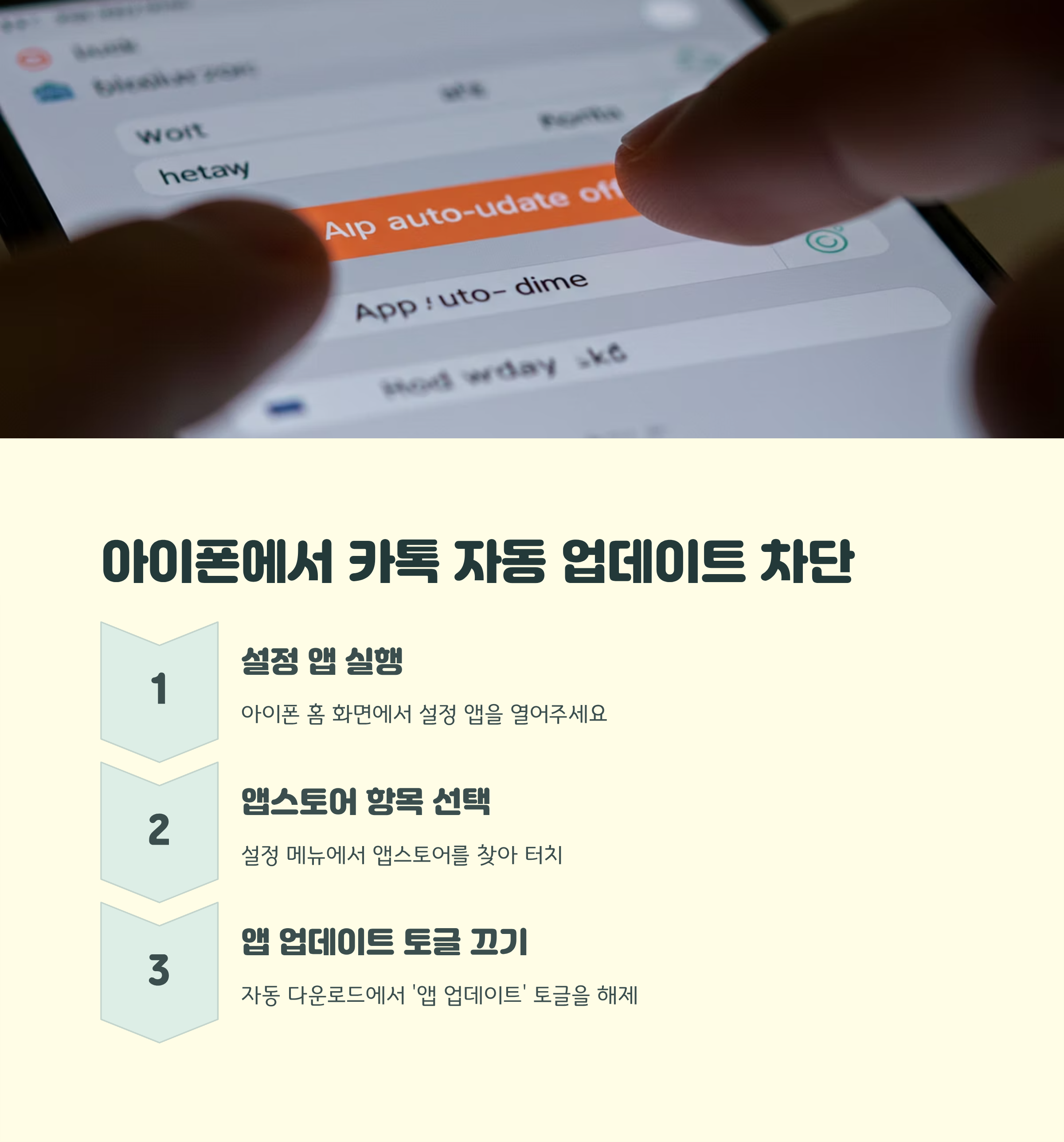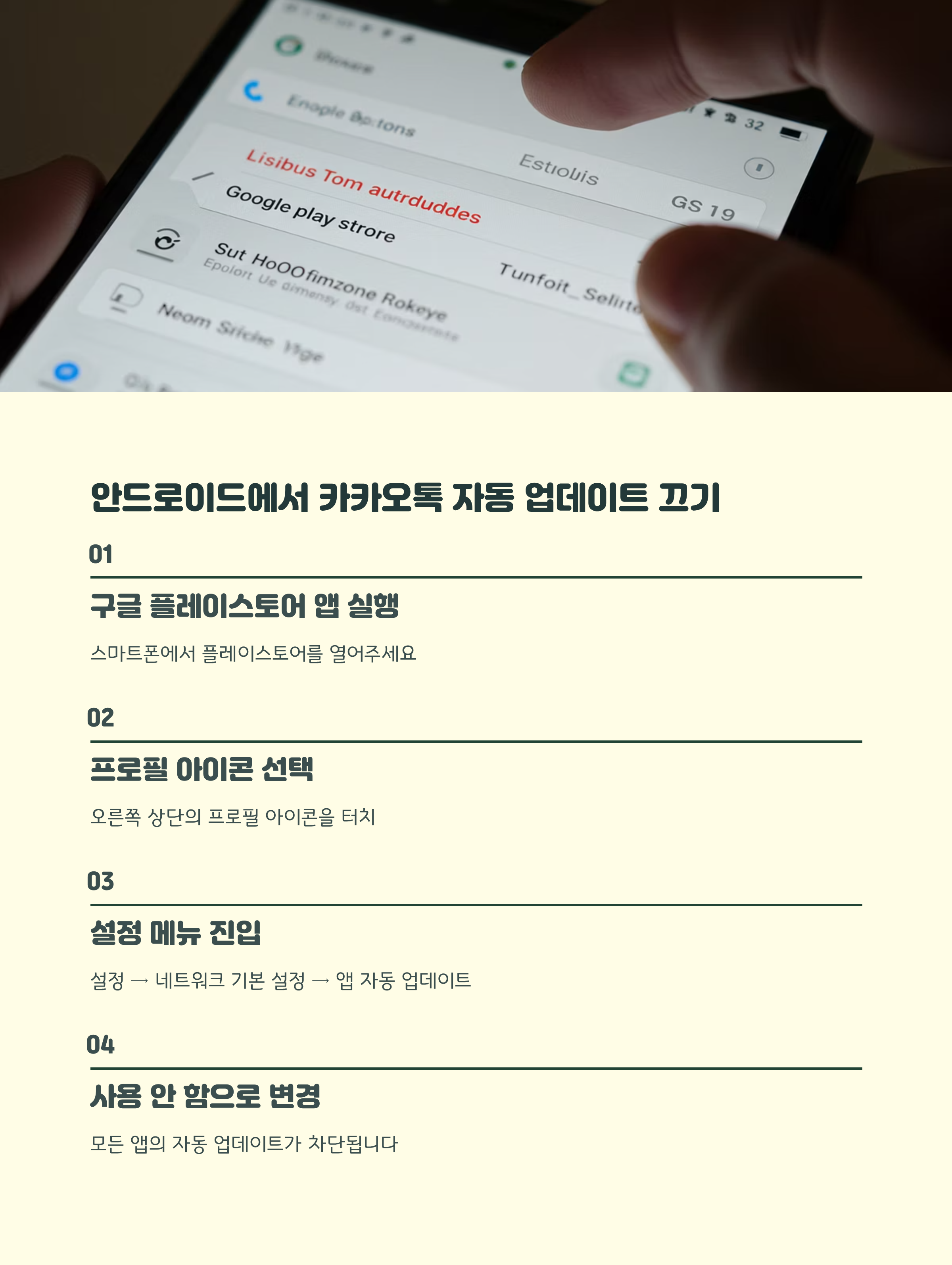 이 설정을 끄면 카톡을 포함해 앱들이 자동으로 업데이트되지 않습니다. 필요할 때만 수동으로 업데이트하면 됩니다.