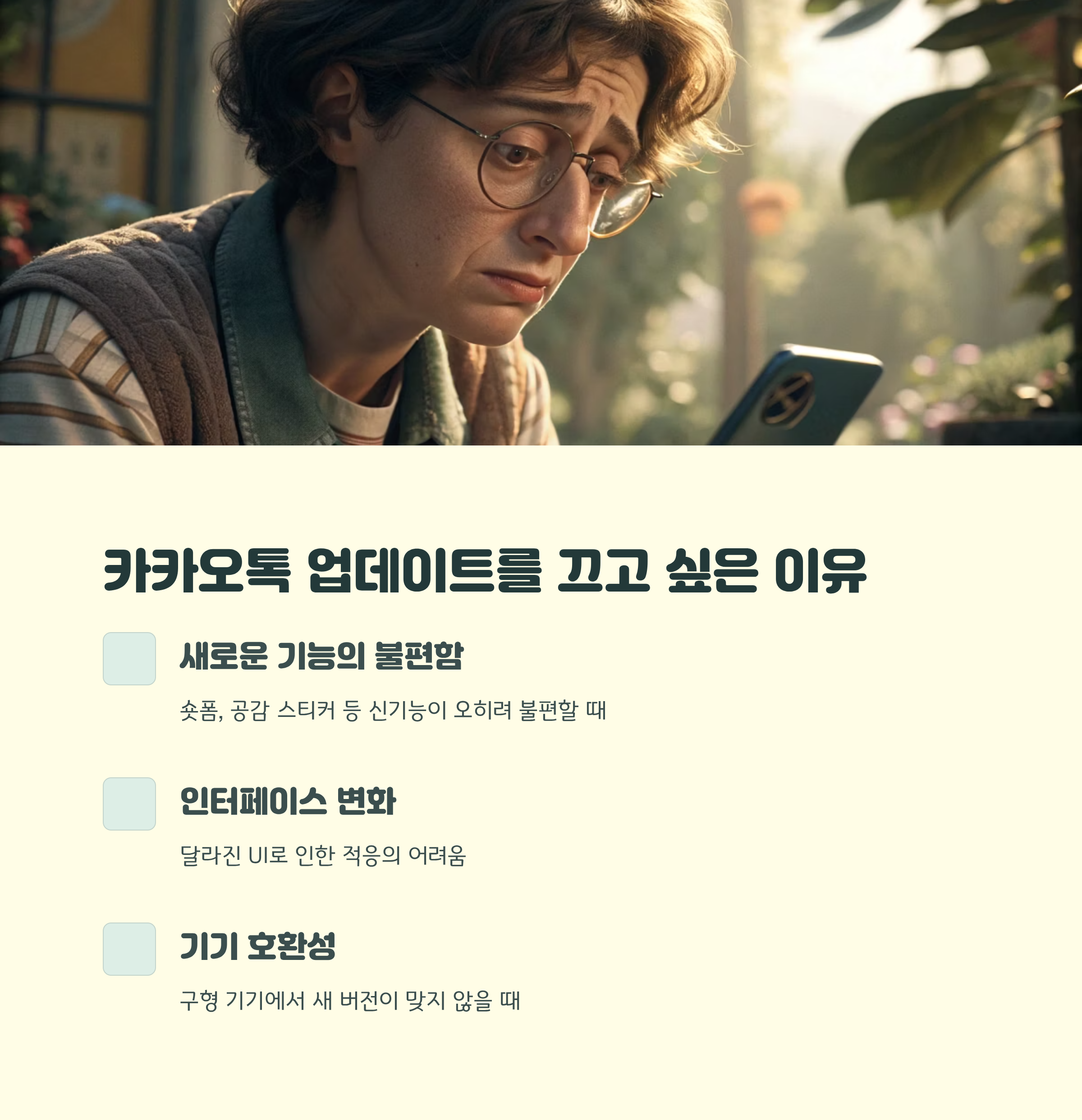 업데이트는 보안 강화와 기능 개선을 위한 필수 과정이지만, 새로운 기능이 오히려 불편하거나 기기에 맞지 않을 때도 있습니다. 예를 들어 숏폼, 공감 스티커 같은 신기능은 호불호가 갈리며, 인터페이스가 달라지면 적응이 힘들 수 있죠. 이런 이유로 많은 분들이 자동 업데이트 차단 방법을 찾습니다.