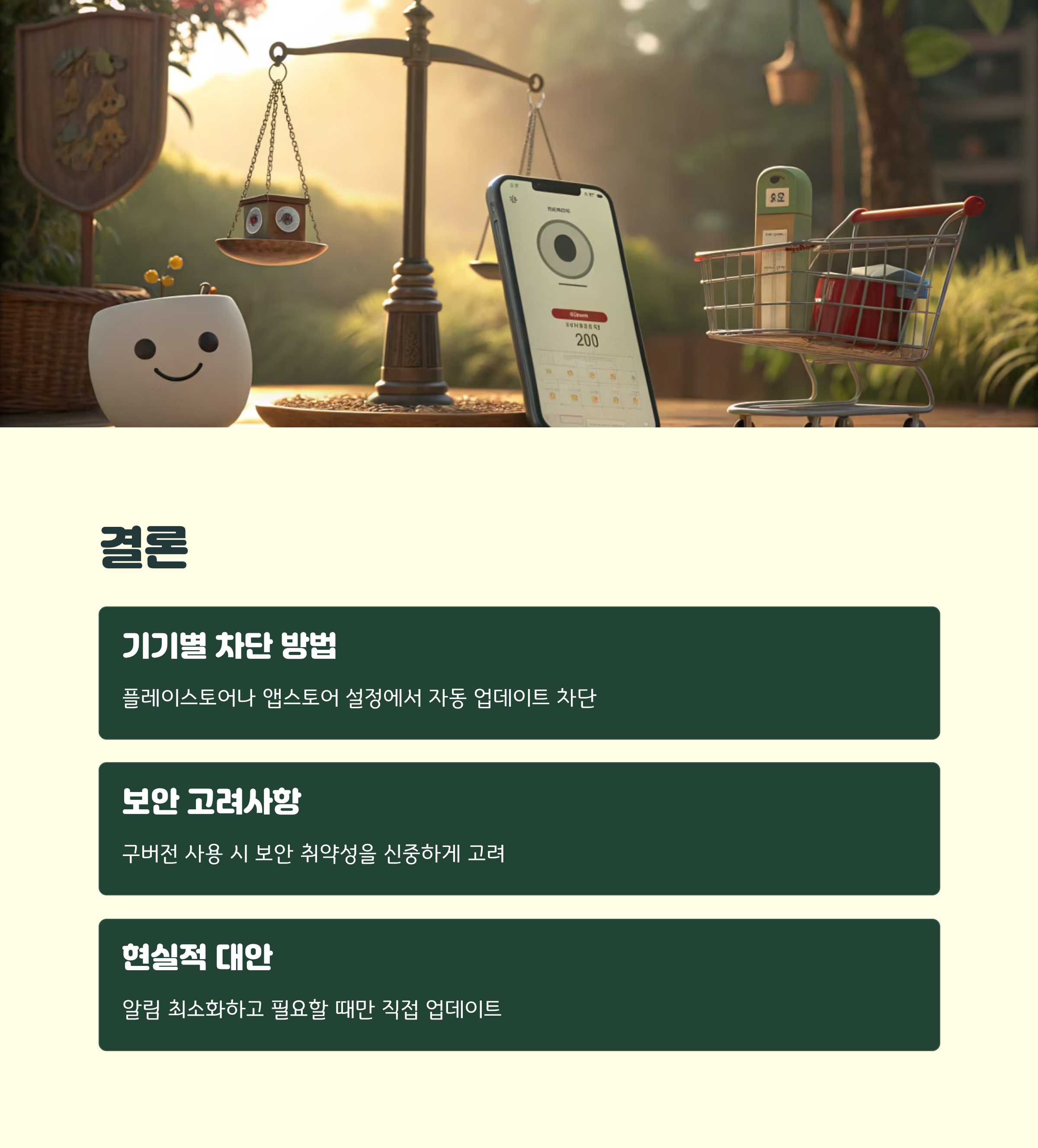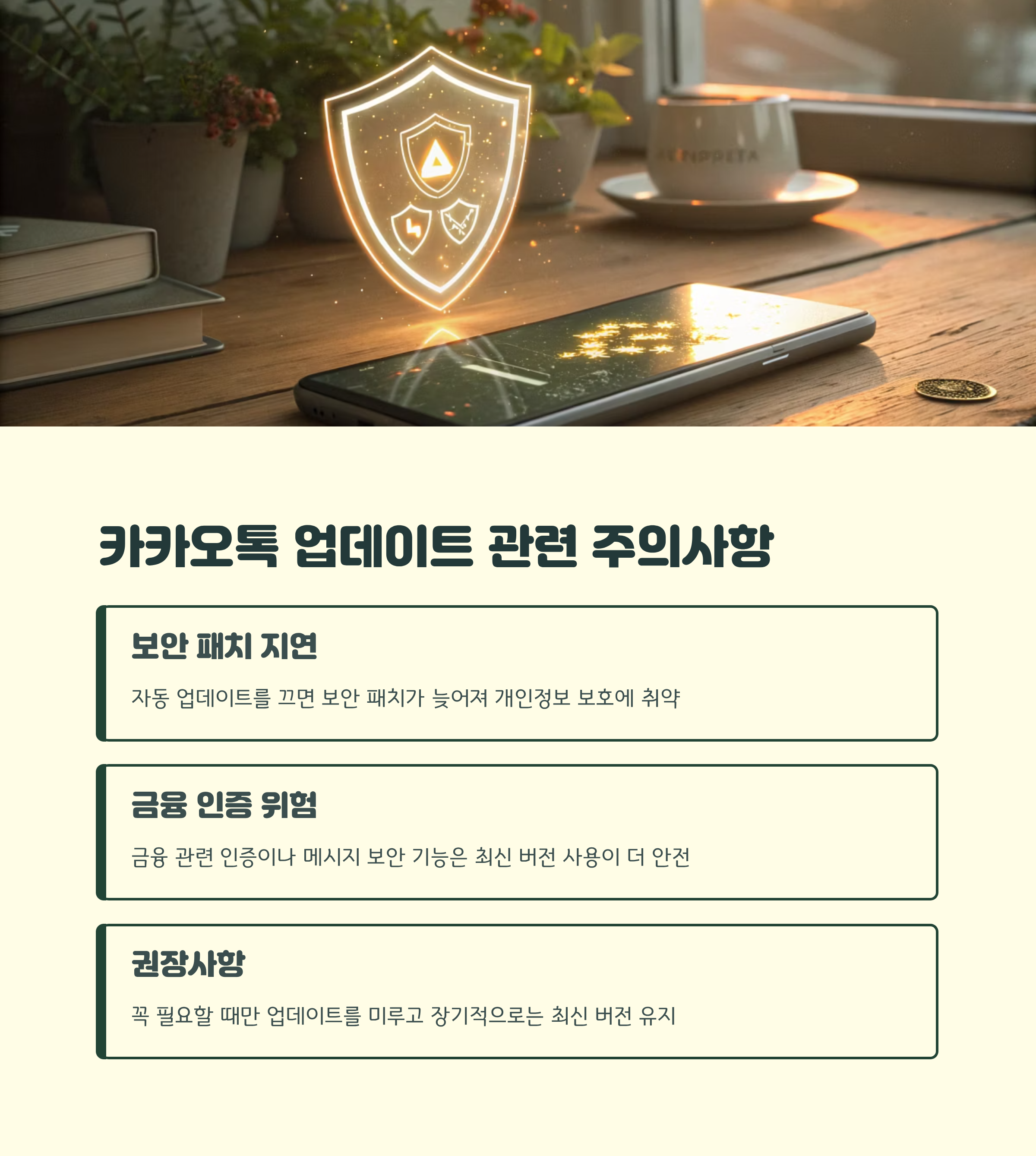 자동 업데이트를 꺼 두면 편리할 수 있지만, 보안 패치가 늦어져 개인정보 보호에 취약해질 수 있습니다. 특히 금융 관련 인증이나 메시지 보안 기능은 최신 버전을 사용하는 것이 더 안전합니다. 따라서 꼭 필요할 때만 업데이트를 미루고, 장기적으로는 최신 버전을 유지하는 것이 좋습니다.