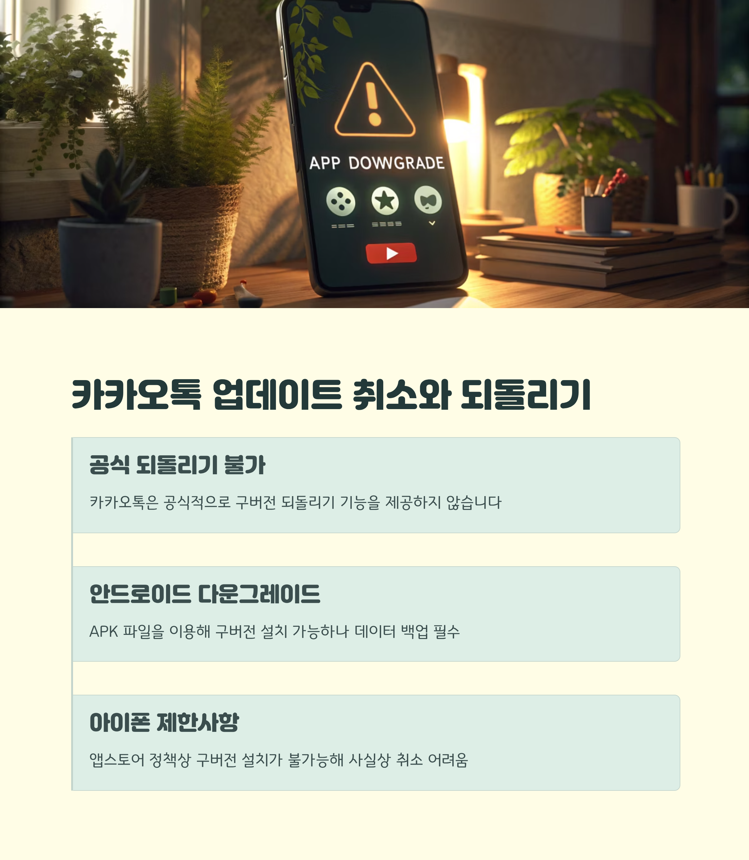 이미 업데이트를 진행한 경우, 공식적으로 ‘되돌리기’ 기능은 제공되지 않습니다. 다만 안드로이드에서는 APK 파일을 구버전으로 설치해 다운그레이드할 수 있습니다. 이 경우 기존 데이터를 백업해 두는 것이 중요합니다. 아이폰은 앱스토어 정책상 구버전 설치가 불가능하므로 사실상 취소가 어렵습니다.