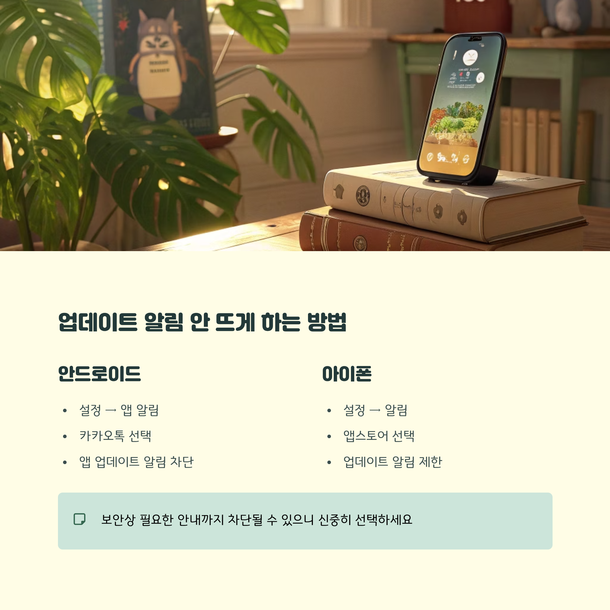 자동 업데이트를 차단해도 때때로 알림이 뜰 수 있습니다. 안드로이드에서는 ‘설정 → 앱 알림 → 카카오톡 → 앱 업데이트 알림 차단’으로 조정할 수 있고, 아이폰에서는 앱스토어 알림을 제한하면 됩니다. 다만 보안상 필요한 안내까지 차단될 수 있으니 신중히 선택하세요.
