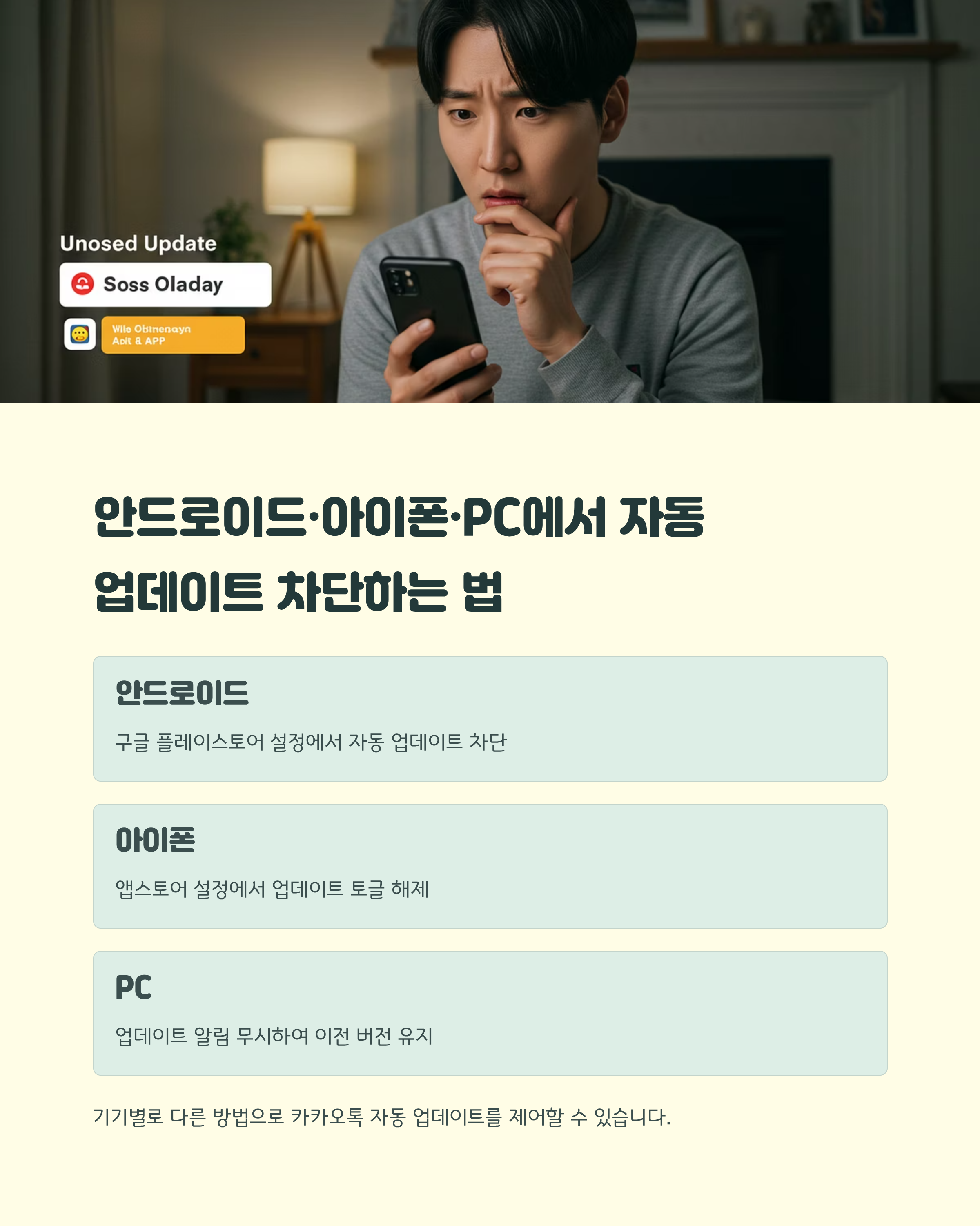 카카오톡을 사용하다 보면 업데이트 후 달라진 기능 때문에 불편함을 호소하는 분들이 많습니다. 특히 자동으로 업데이트가 진행되거나, 원치 않는 기능이 추가될 때는 예전 버전을 유지하고 싶어지죠. 이 글에서는 카카오톡 업데이트를 끄거나 취소하는 방법, 그리고 자동 업데이트 알림이 뜨지 않게 설정하는 법을 기기별로 정리해 드리겠습니다.