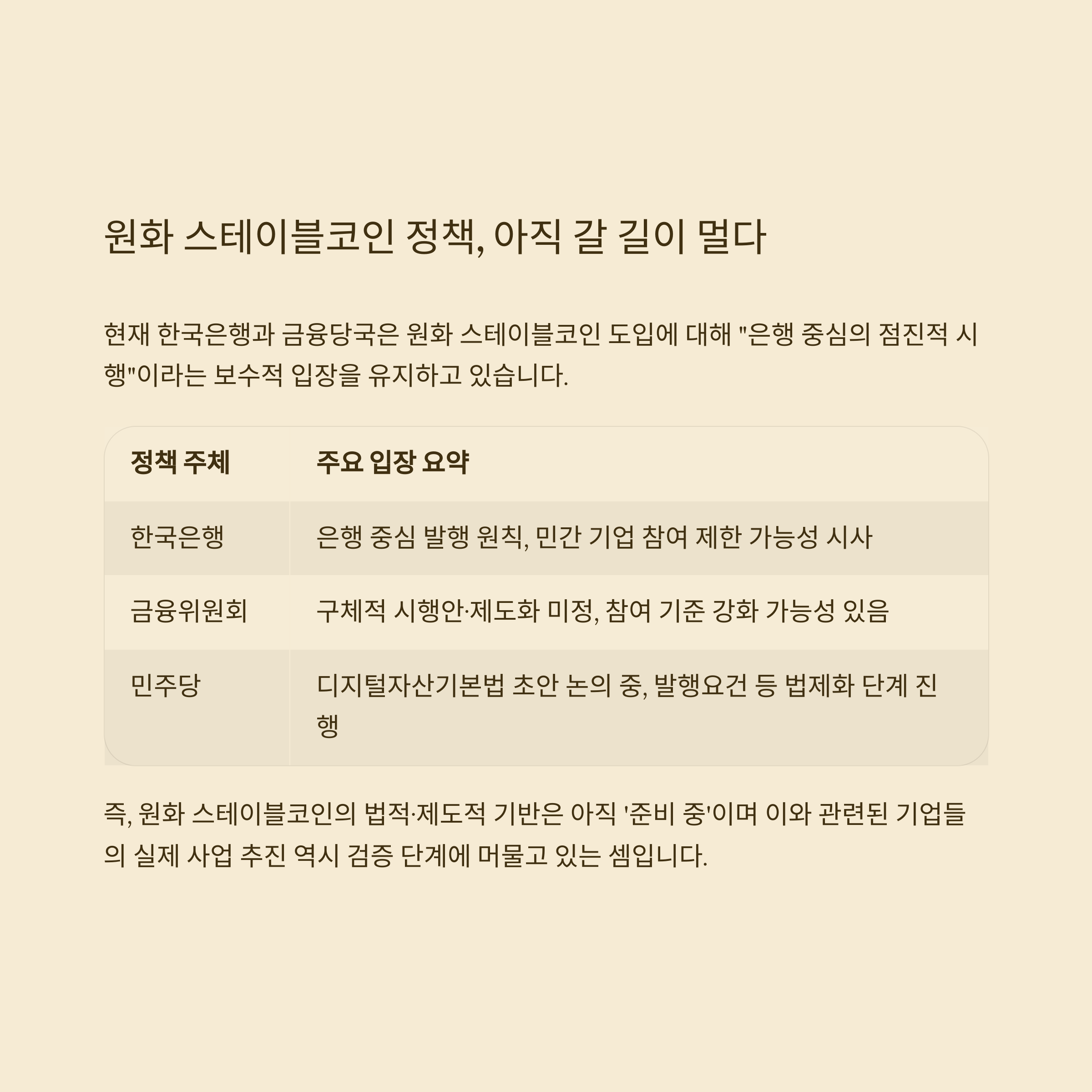즉, 원화 스테이블코인의 법적·제도적 기반은 아직 ‘준비 중’이며 이와 관련된 기업들의 실제 사업 추진 역시 검증 단계에 머물고 있는 셈입니다.