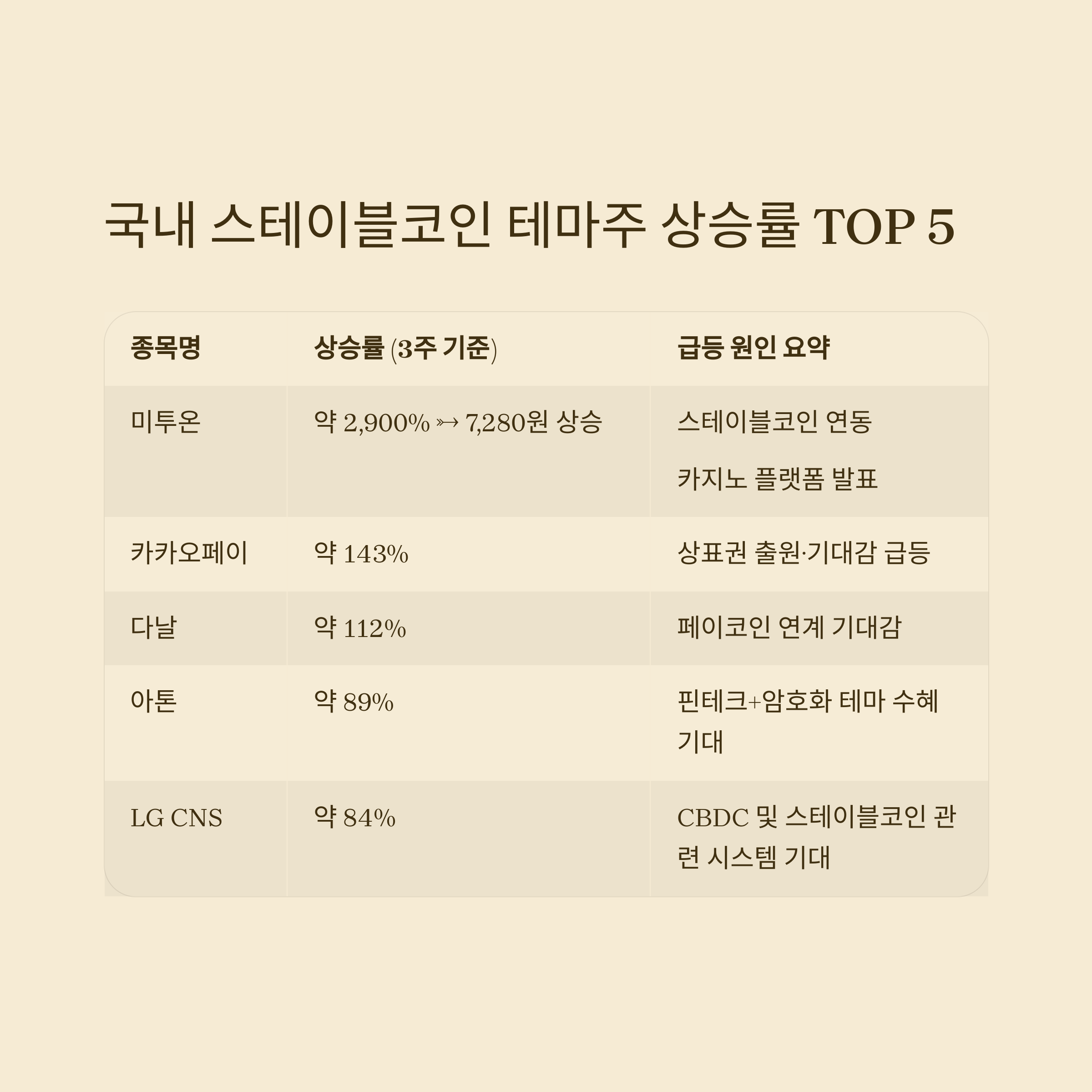 | 미투온 | 약 2,900% → 7,280원 상승 | 스테이블코인 연동 카지노 플랫폼 발표 |