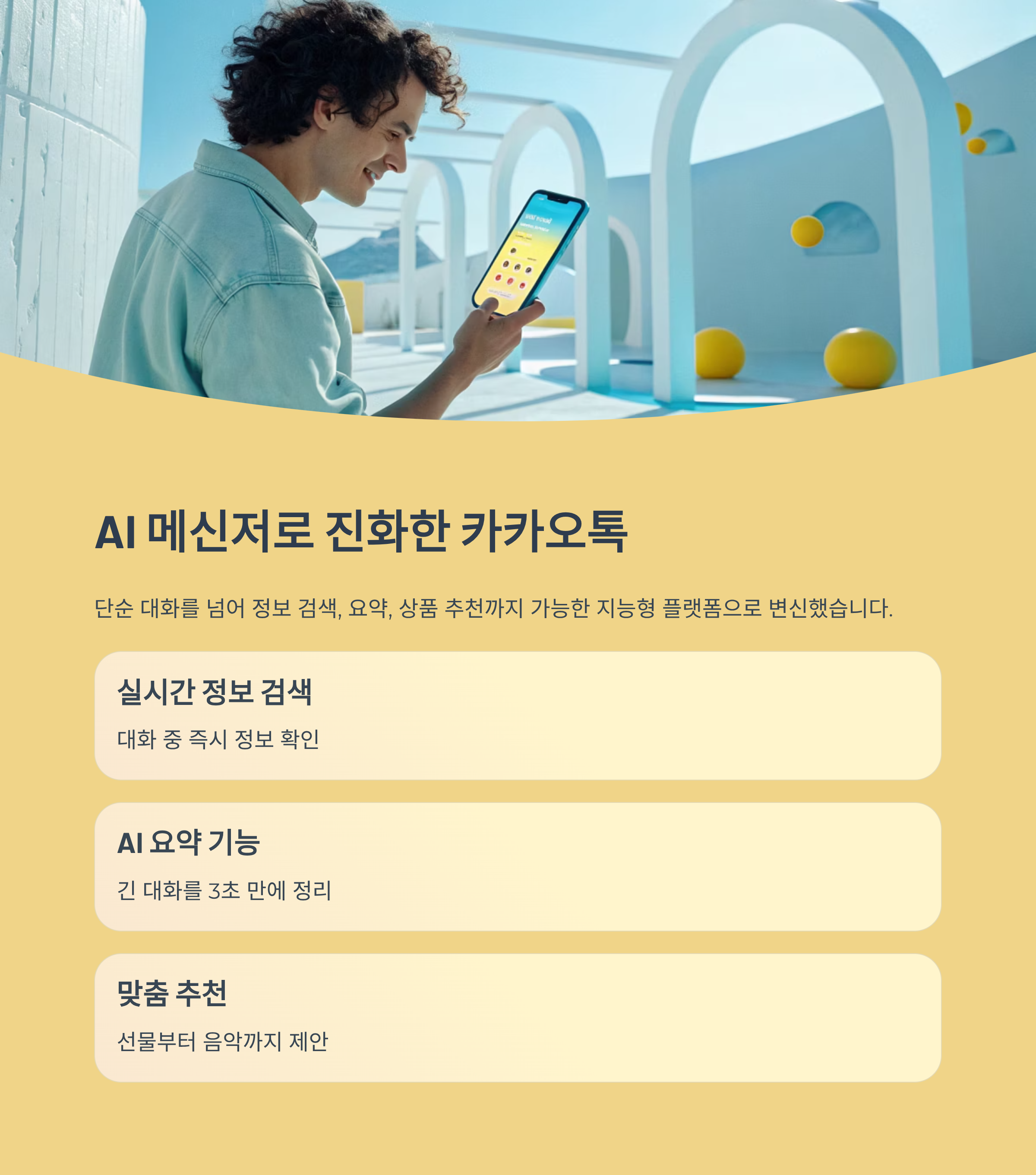 카카오톡은 단순한 메시지 앱이 아니에요. 이제부터는 AI를 탑재한 지능형 플랫폼으로 거듭났습니다.