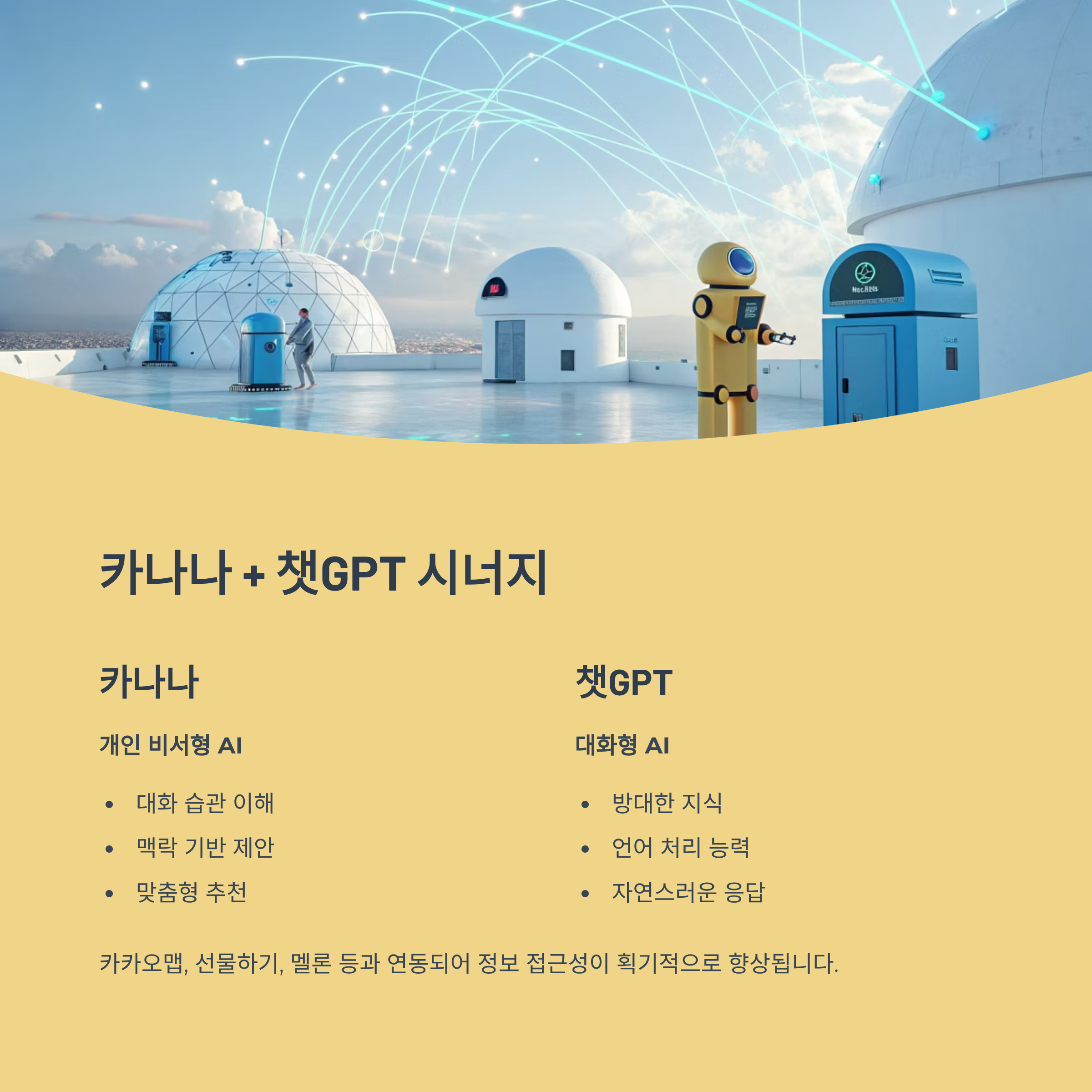 카나나는 사용자의 대화 습관과 맥락을 이해해 맞춤형 제안을 해주는 개인 비서형 AI이고, 챗GPT는 방대한 지식과 언어 처리 능력을 갖춘 대화형 AI로 협력 관계를 이룹니다.
