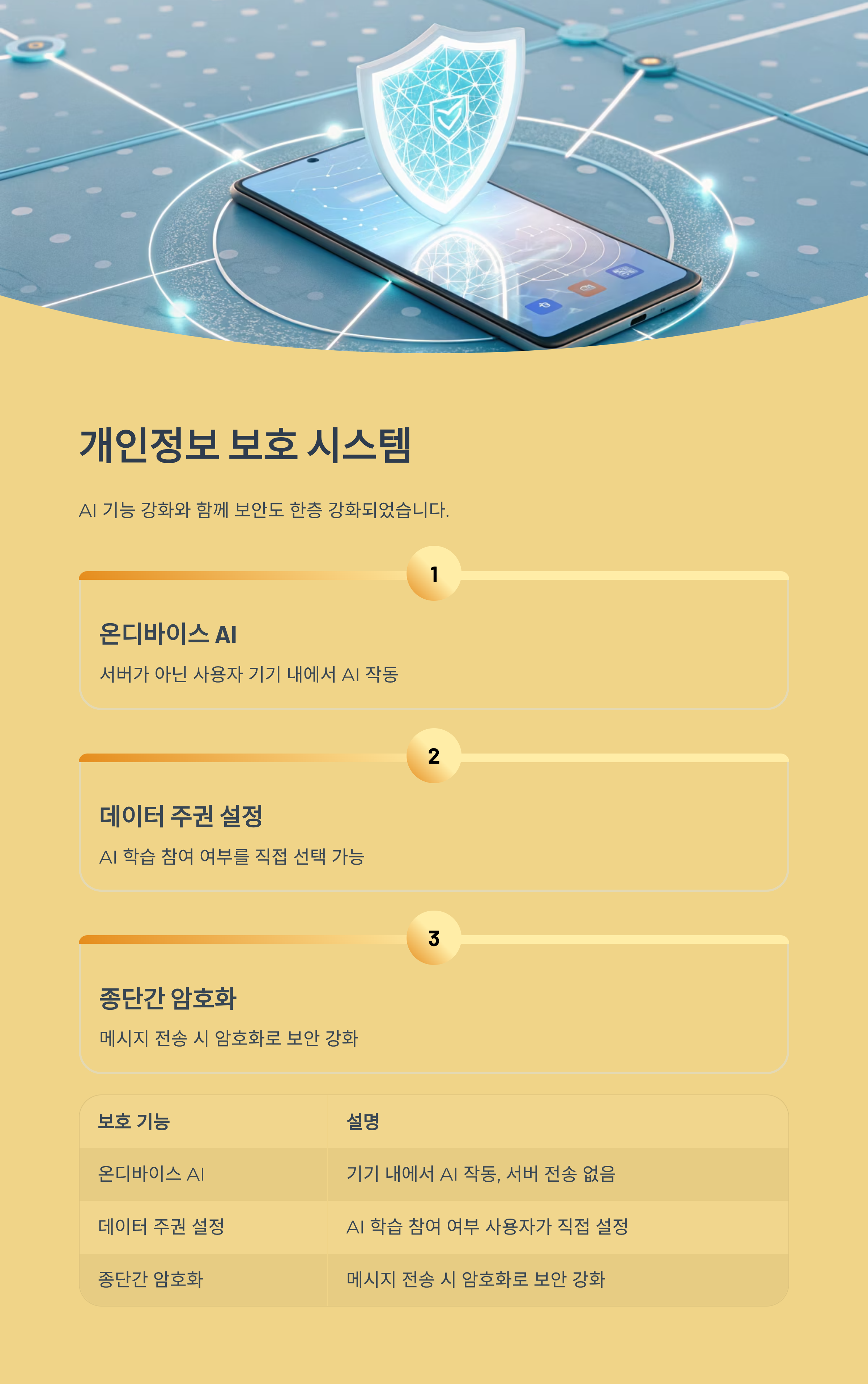 AI 기능이 강화되면 개인정보 걱정도 커지기 마련이죠. 하지만 카카오는 온디바이스 AI 구조를 통해 서버가 아닌 사용자 기기 내에서 AI가 작동하도록 설계해 개인정보 노출 위험을 줄였습니다.
