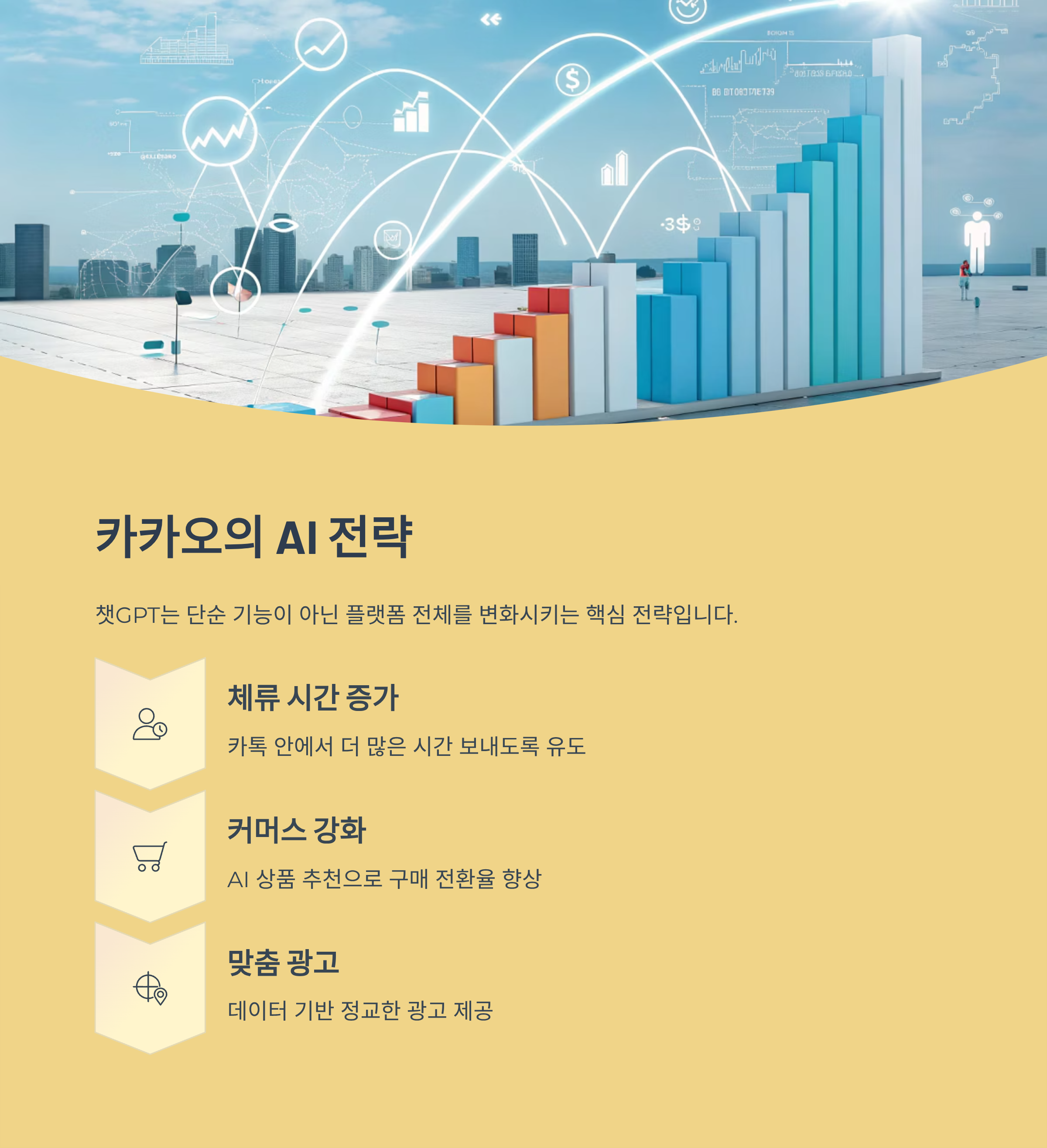 챗GPT를 단순히 기능으로만 보면 오산입니다. 카카오는 AI를 통해 플랫폼 체류 시간을 늘리고, 커머스 및 광고 수익을 강화하는 전략을 실행 중이에요.