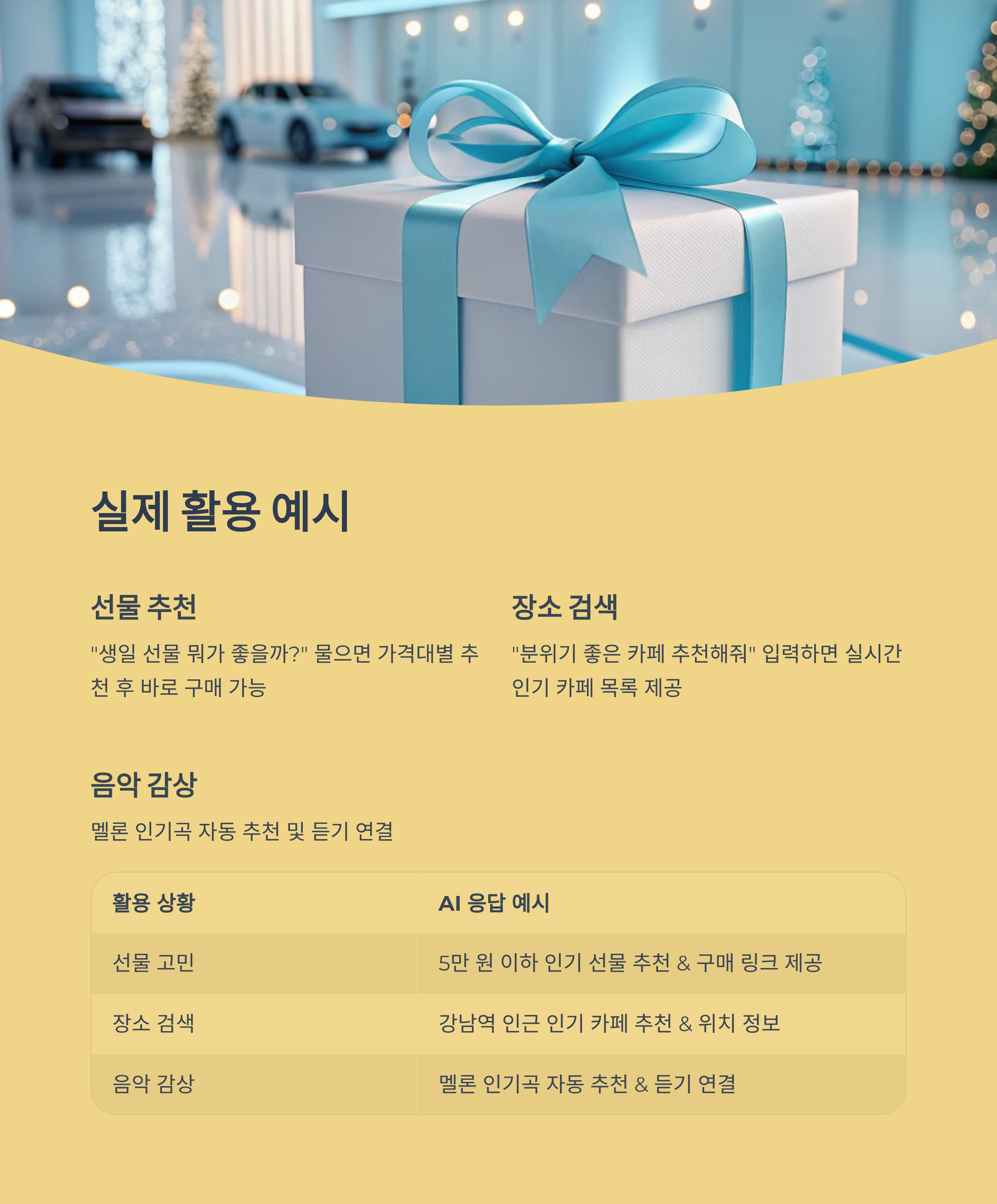 챗GPT가 탑재되며 사용자는 기존보다 훨씬 간편하게 다양한 기능을 활용할 수 있게 되었고, 대화 도중 실시간 정보 검색, 요약, 번역, 선물 추천, 음악 감상까지 끊김 없이 이어질 수 있어요.