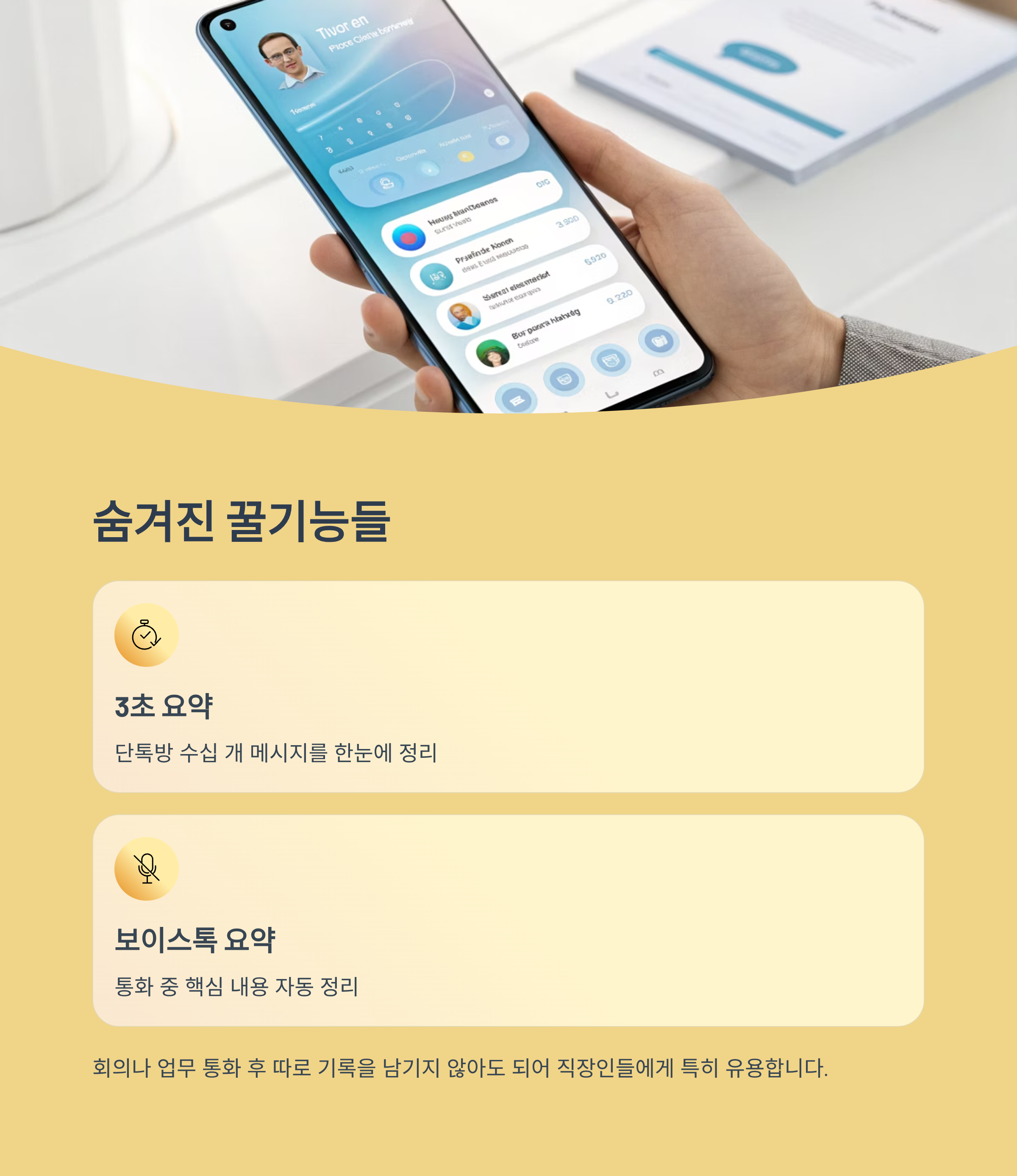 가장 실용적인 기능은 단연 ‘3초 요약’. 단톡방에서 하루만 지나도 수십 개의 메시지가 쌓이는데, 이걸 한눈에 정리해주는 요약 기능은 직장인들에게 정말 유용하죠.