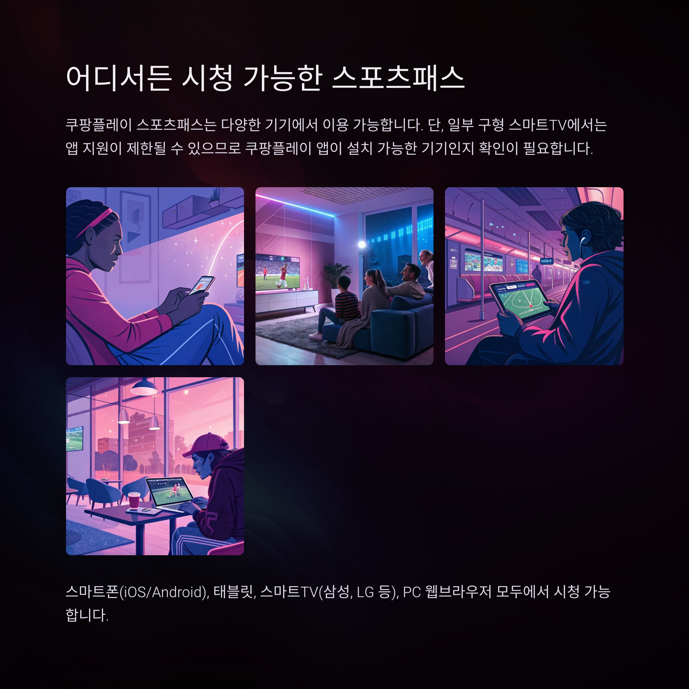 쿠팡플레이 스포츠패스는 다음 기기에서 모두 이용 가능합니다.