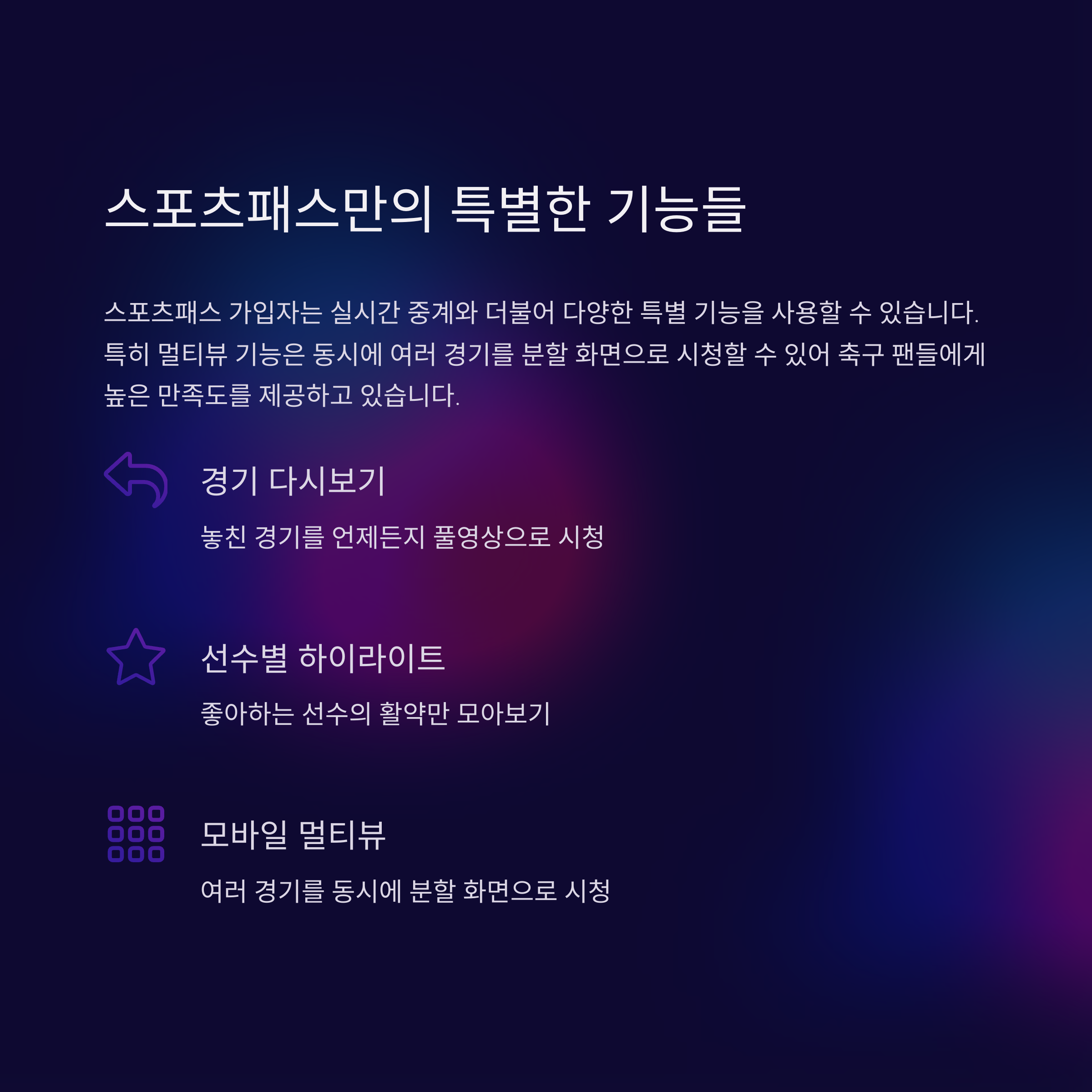해외 스포츠 중계 콘텐츠를 별도로 시청할 수 있는 유료 부가서비스입니다.