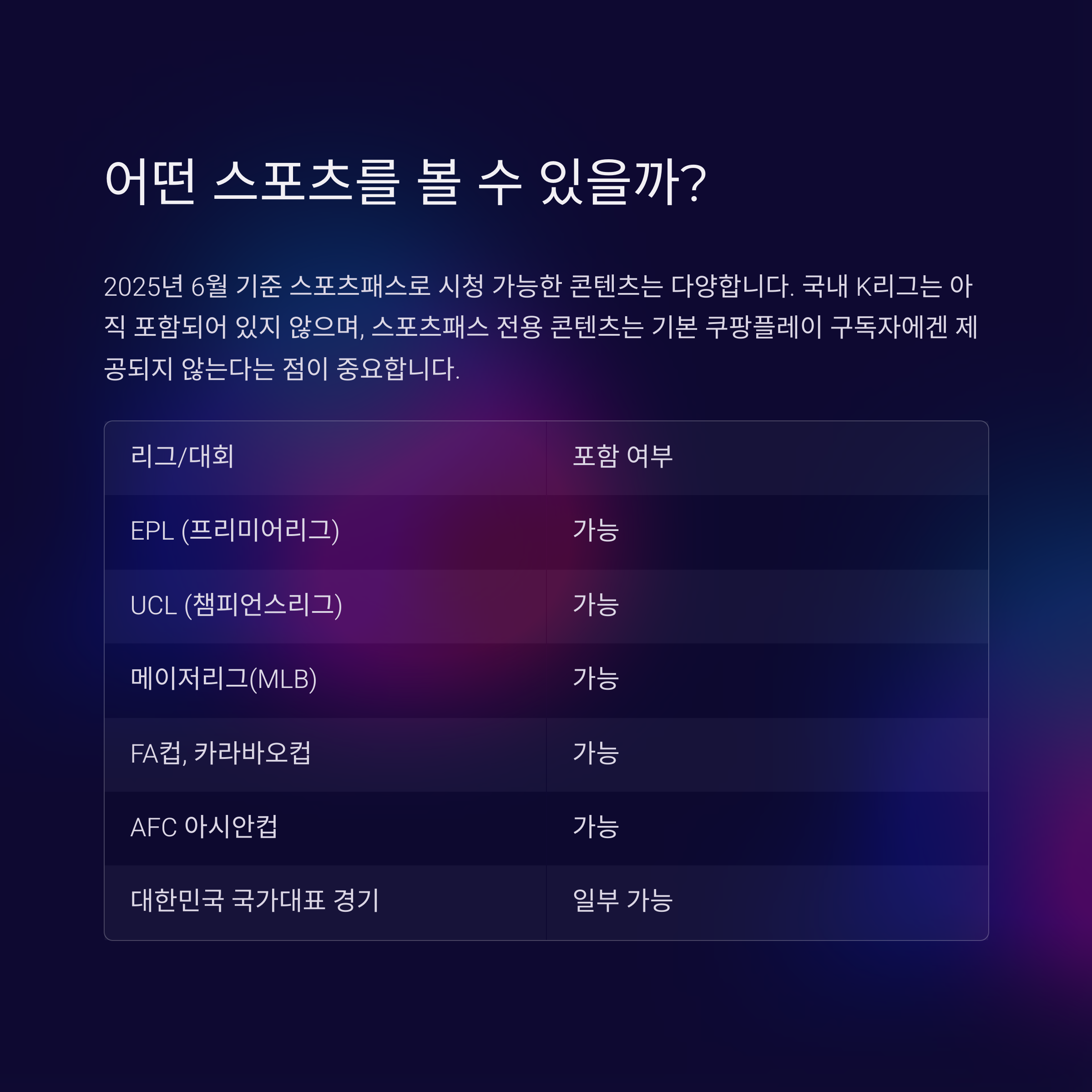 아래 표는 2025년 6월 기준 스포츠패스로 시청 가능한 콘텐츠입니다.