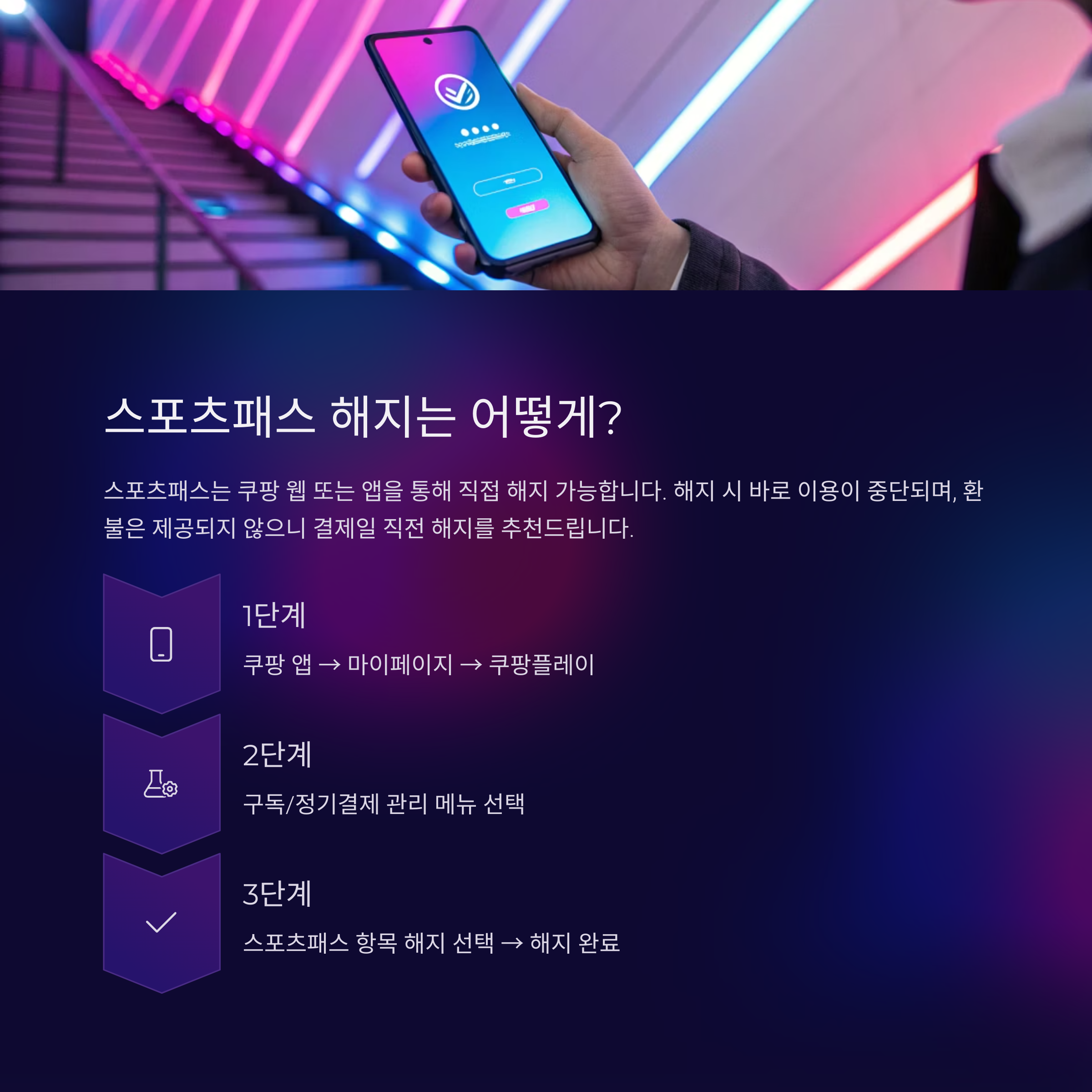 스포츠패스는 쿠팡 웹 또는 앱을 통해 직접 해지 가능합니다.