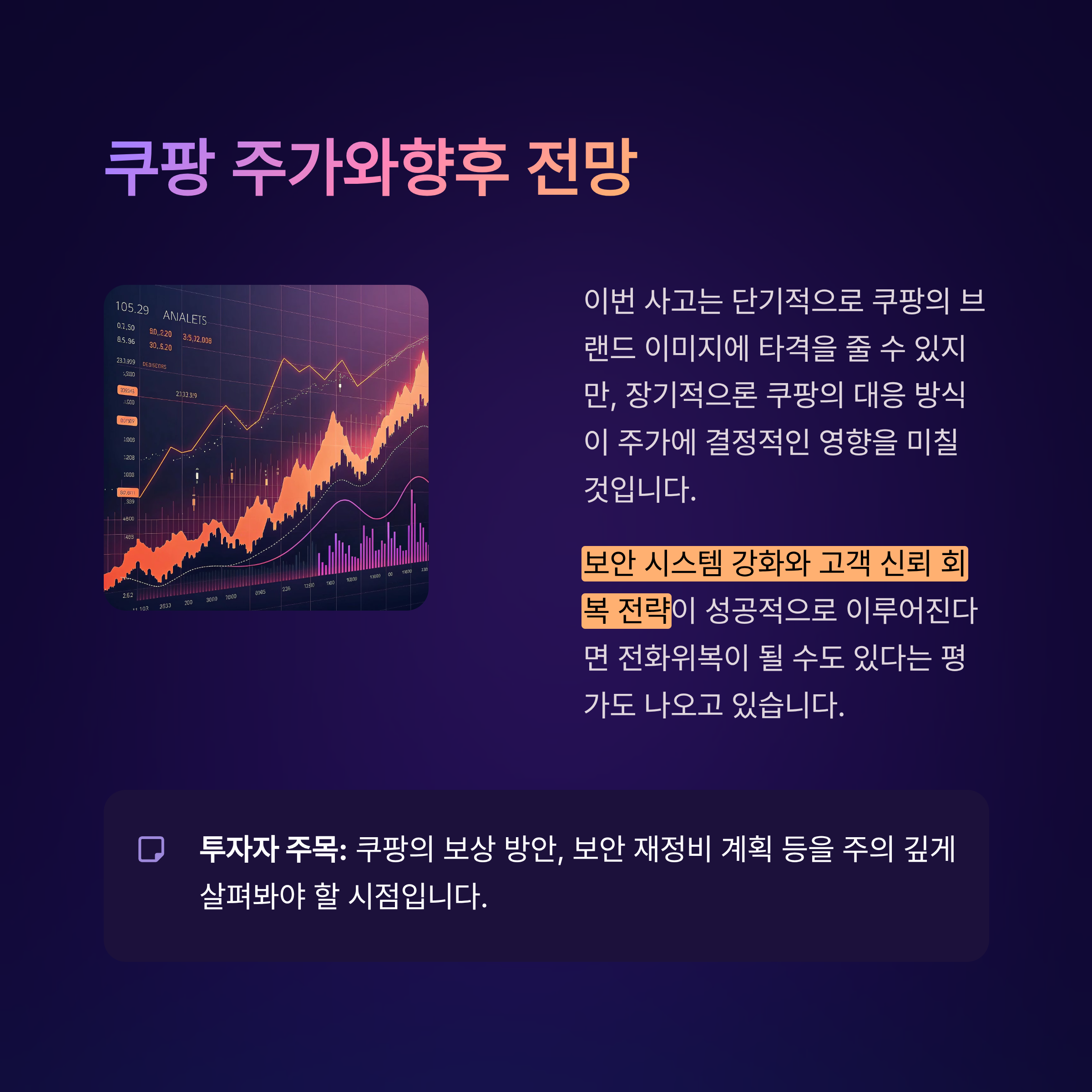 이번 사고는 단기적으로 쿠팡의 브랜드 이미지에 타격을 줄 수 있지만, 장기적으론 쿠팡의 대응 방식이 주가에 결정적인 영향을 미칠 것입니다.