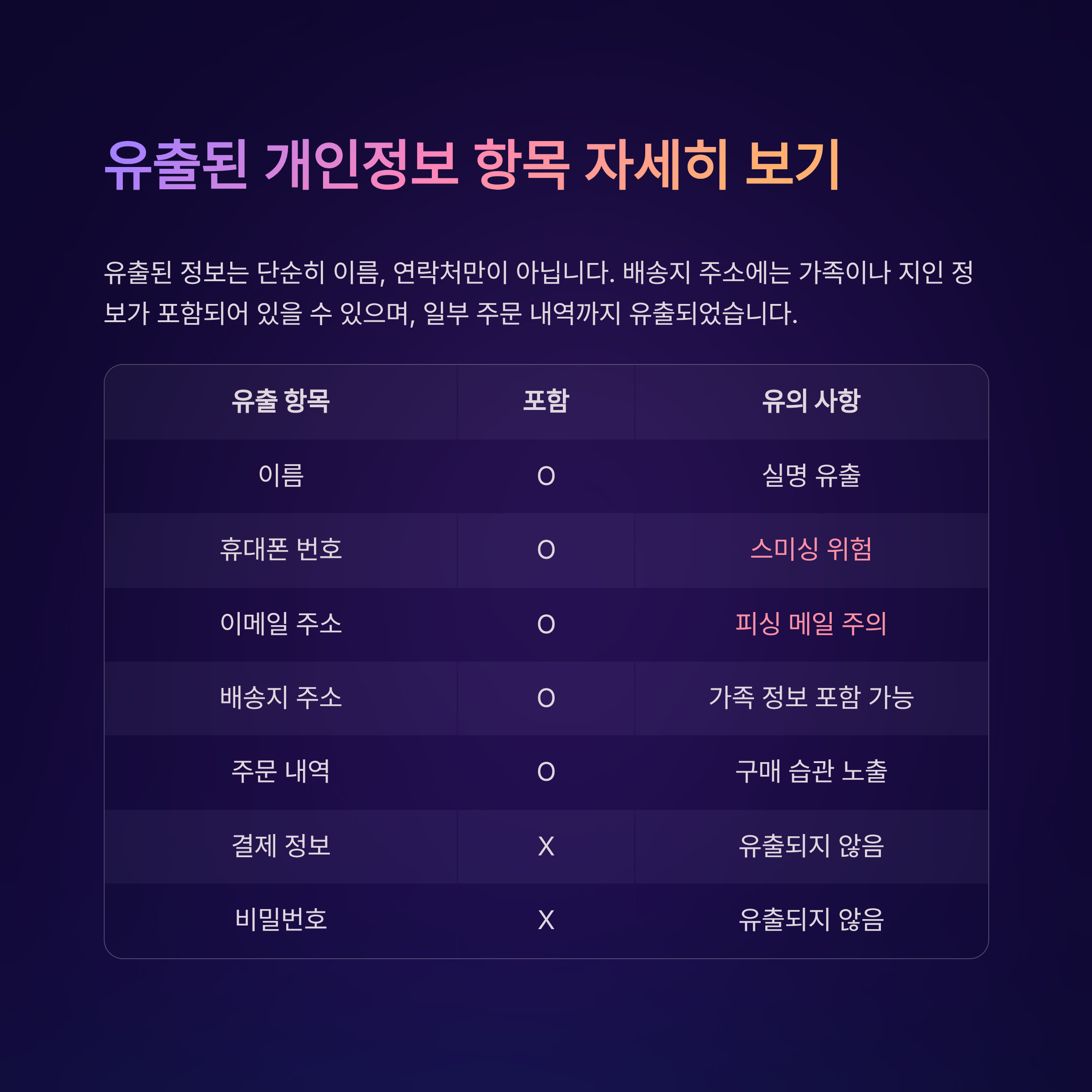 배송지 주소에는 가족이나 지인의 정보가 포함되어 있을 수 있으며, 일부 주문 내역까지 유출되었다는 점에서 프라이버시 침해 우려가 큽니다.