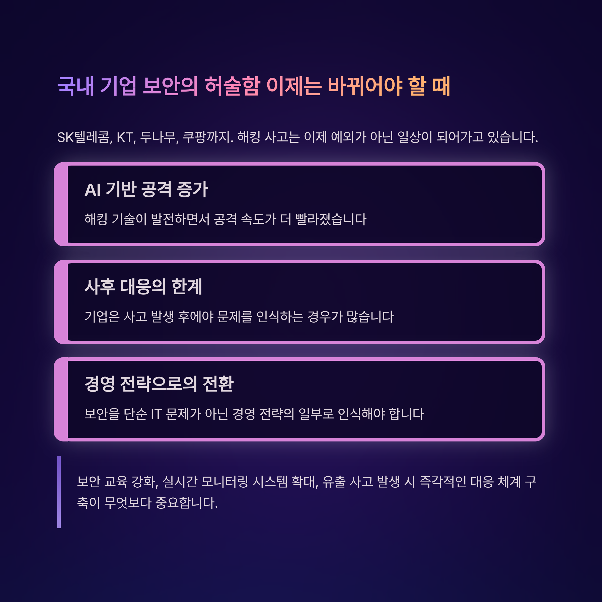 보안을 단순 IT 문제가 아닌 경영 전략의 일부로 인식하고, 정부와 기업이 함께 대책을 마련해야 할 때입니다.
