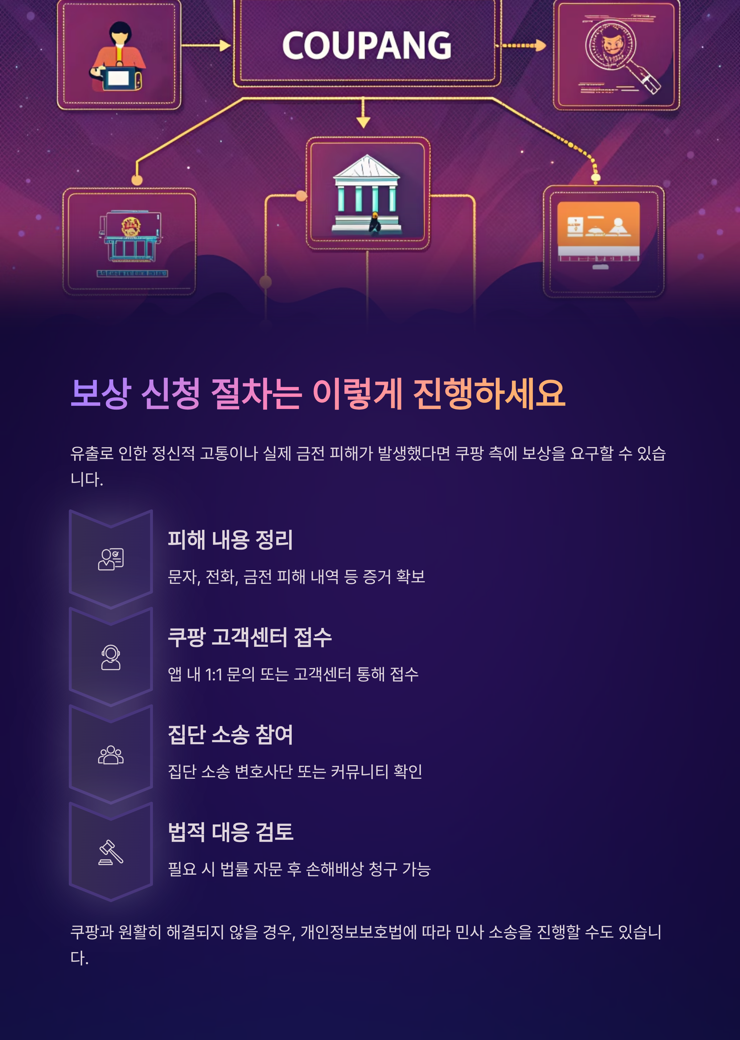 유출로 인한 정신적 고통이나 실제 금전 피해가 발생했다면 쿠팡 측에 보상을 요구할 수 있습니다.