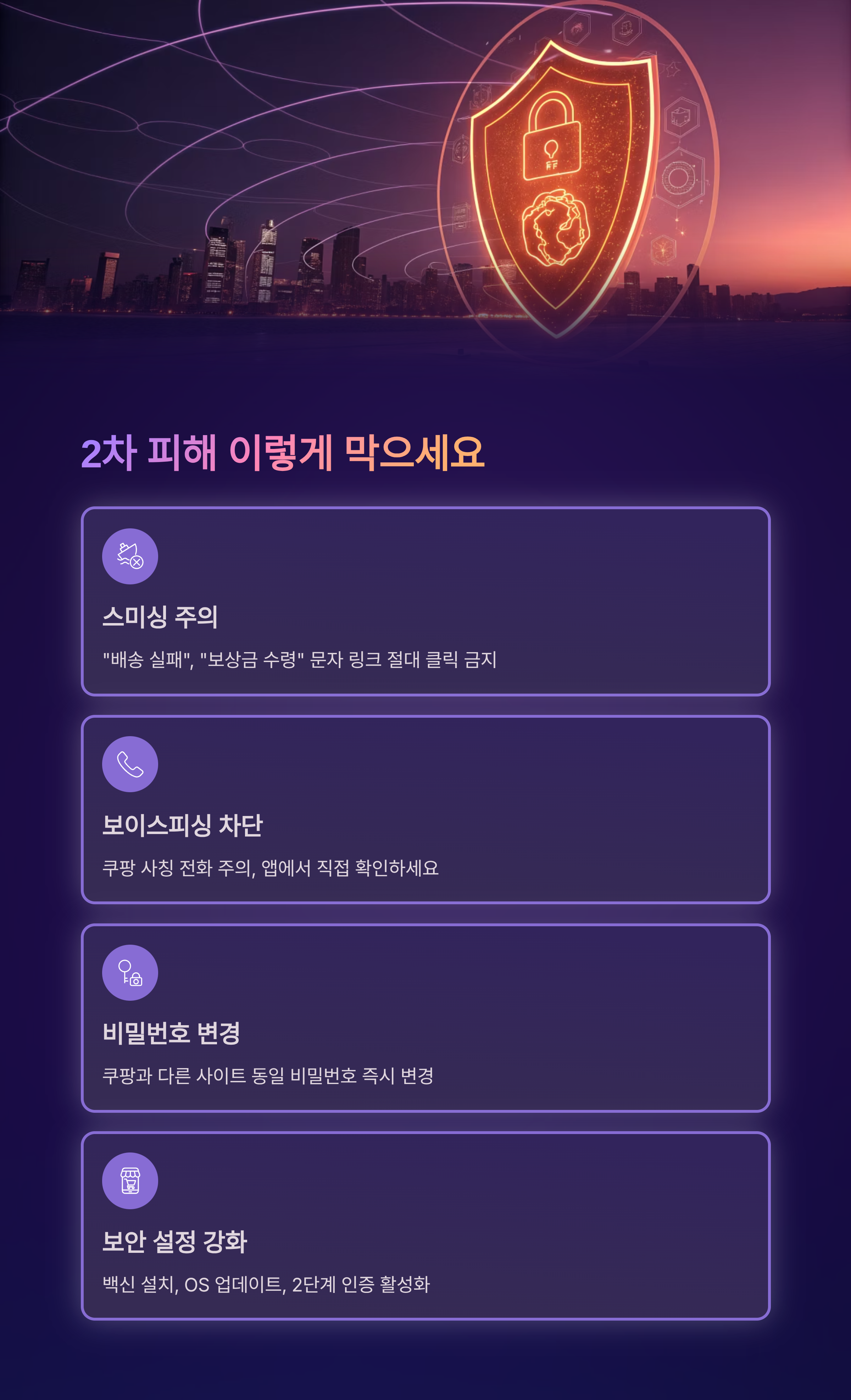 "주소 오류로 배송 실패", "보상금 수령 안내" 등의 문자가 오면 절대 링크를 누르지 마세요. 전화가 오더라도 쿠팡을 사칭하는 경우가 많으므로 앱에서 직접 확인하는 습관을 들이세요.