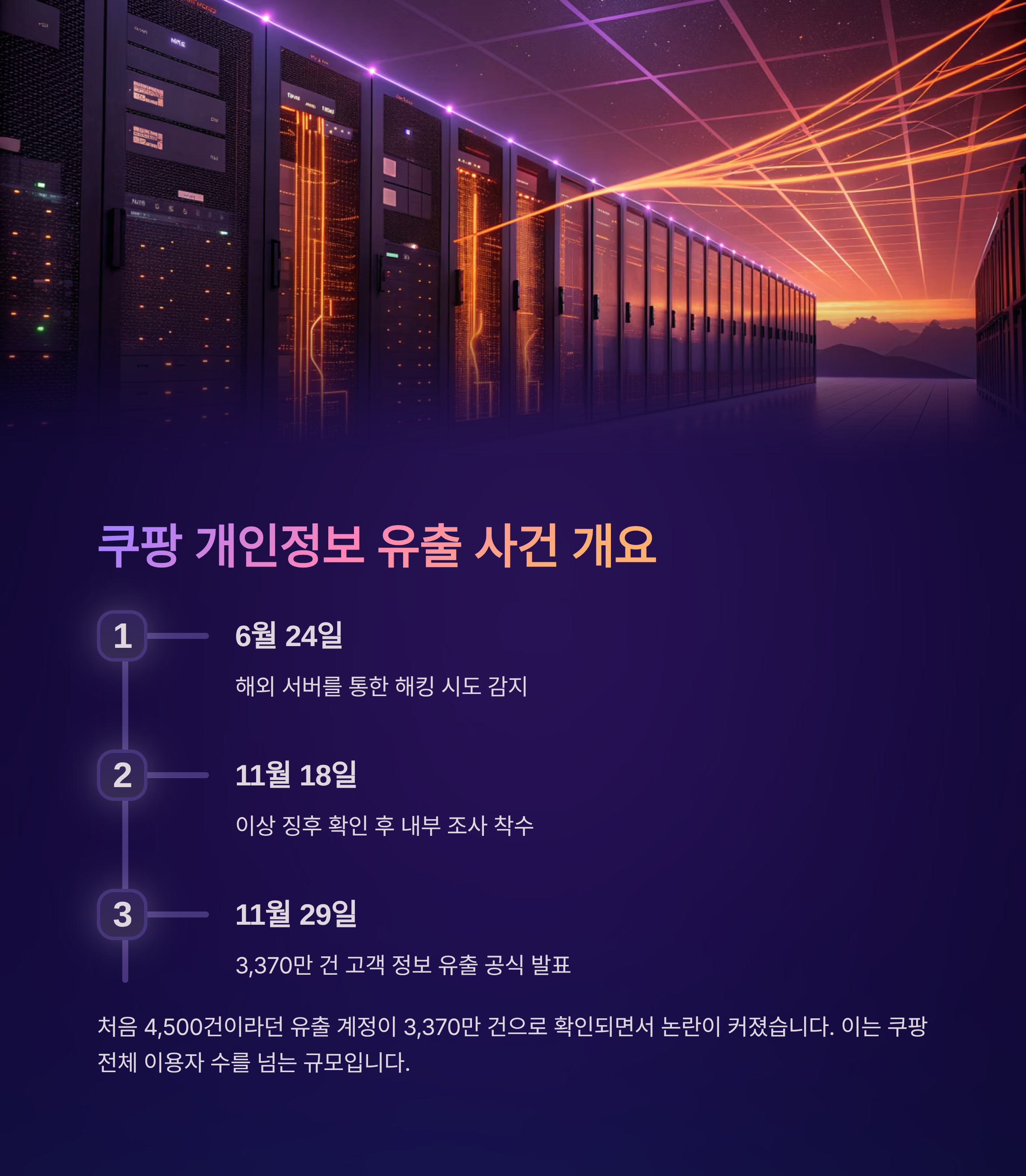 2024년 6월 24일, 해외 서버를 통한 해킹 시도가 감지되었고, 쿠팡은 11월 18일에 이상 징후를 확인한 후 내부 조사에 착수했습니다.