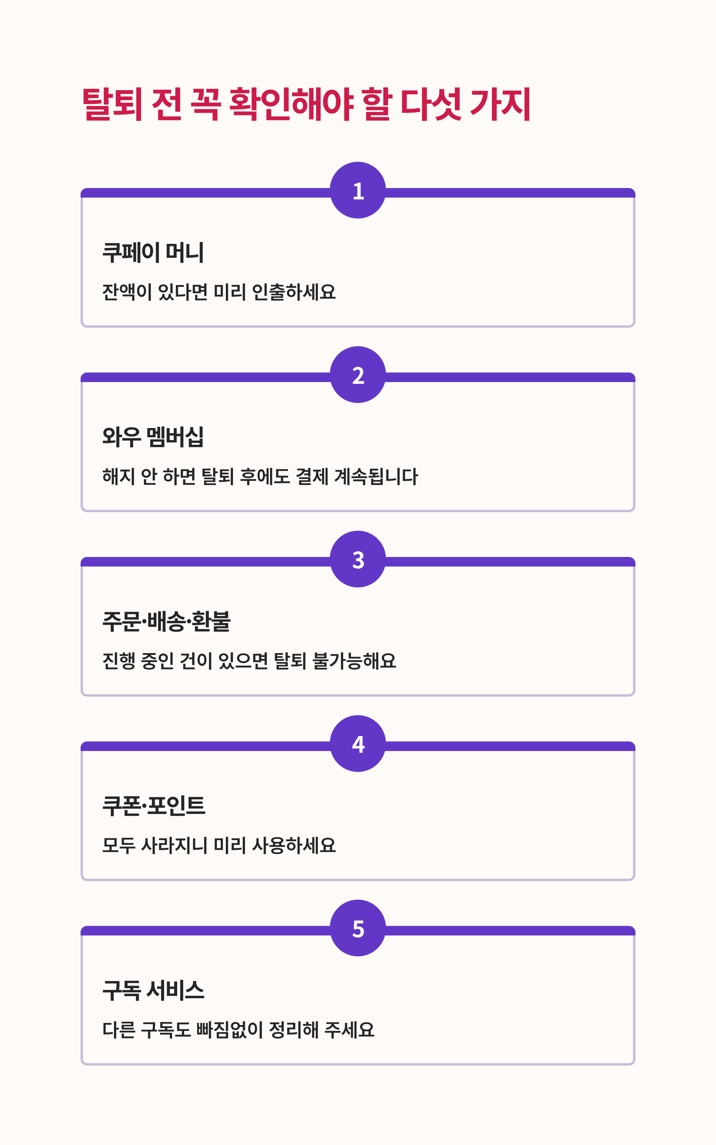 그리고 쿠팡 와우 멤버십. 이거 해지 안 하면 탈퇴 후에도 결제가 계속될 수 있답니다. 다른 구독 서비스도 빠짐없이 정리해 주세요.