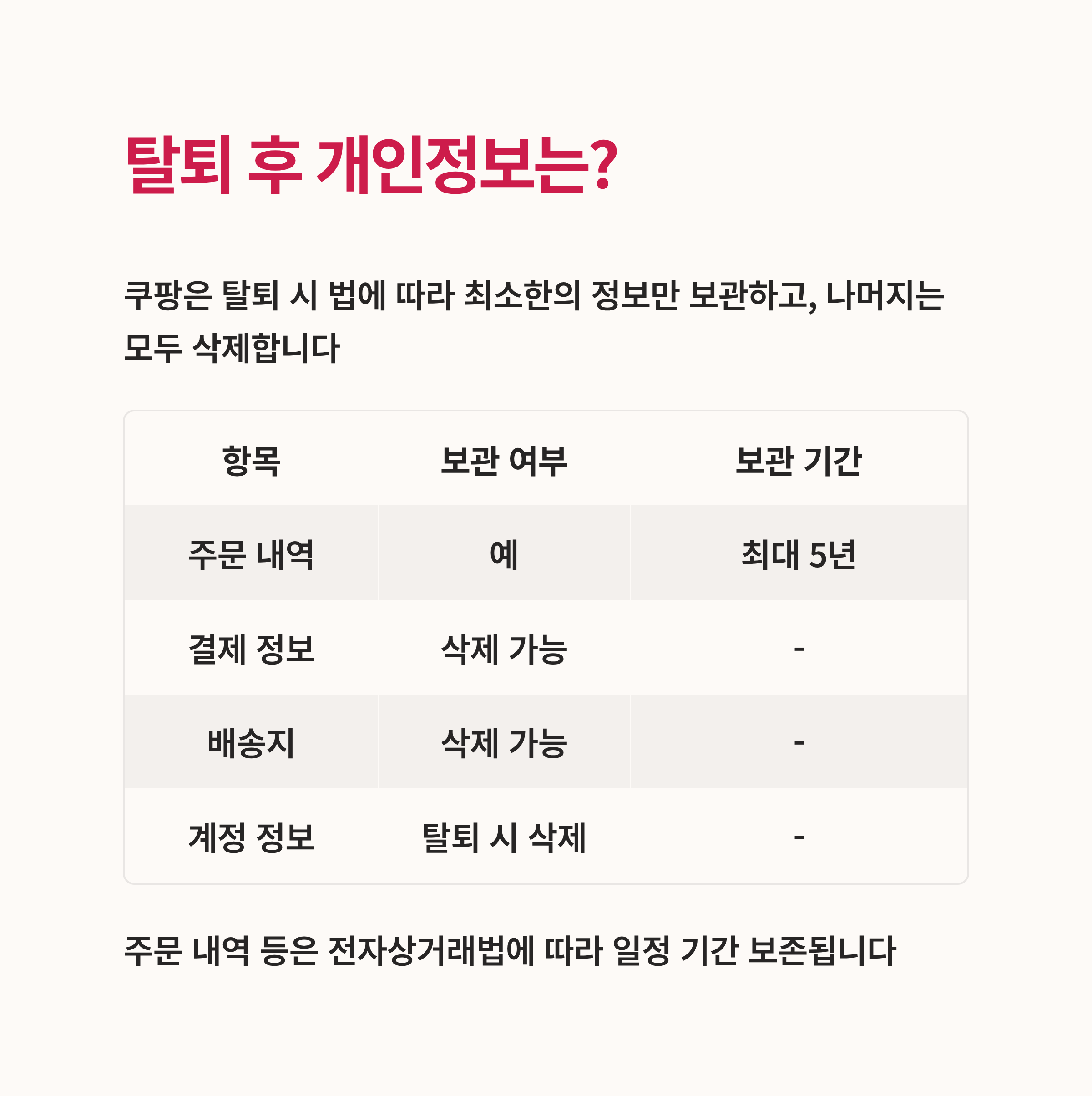 쿠팡은 탈퇴 시 법에 따라 최소한의 정보만 보관하고, 나머지는 모두 삭제합니다. 단, 주문 내역 등은 전자상거래법에 따라 일정 기간 보존되죠.