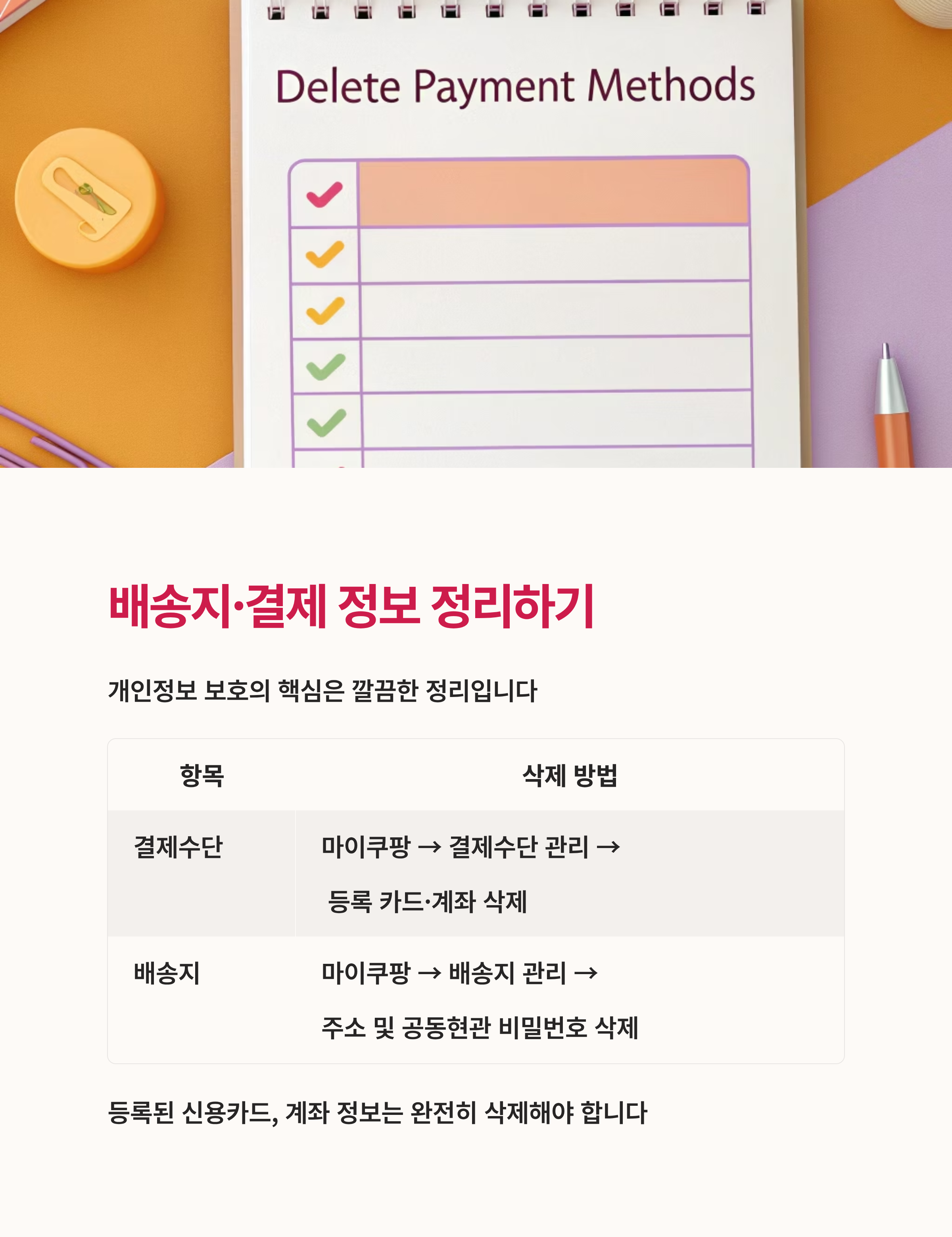 | 결제수단 | 마이쿠팡 > 결제수단 관리 > 등록 카드·계좌 삭제 |