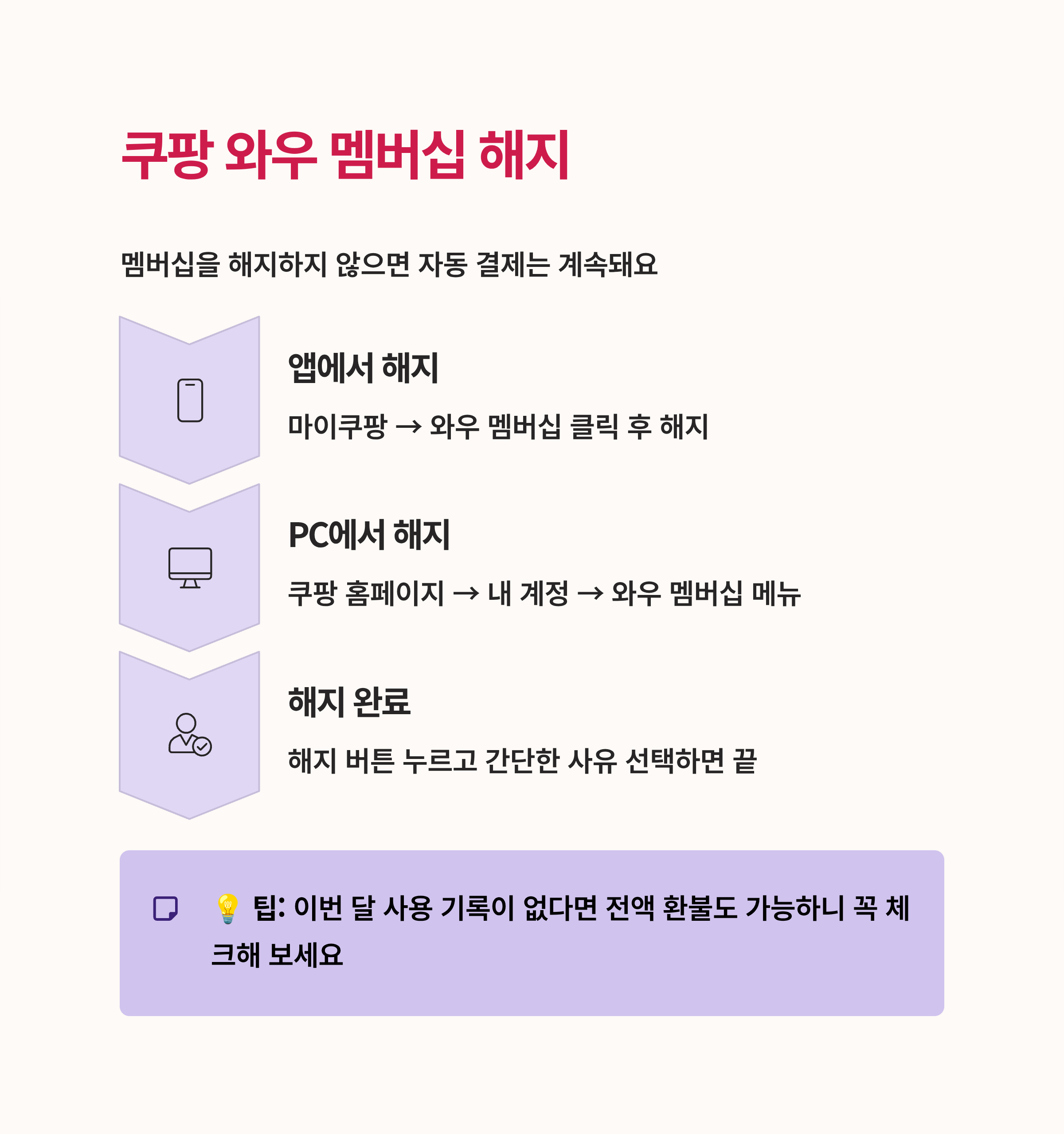 멤버십을 해지하지 않으면 자동 결제는 계속돼요. 앱에서 ‘마이쿠팡 > 와우 멤버십’ 클릭 후 해지하면 끝.