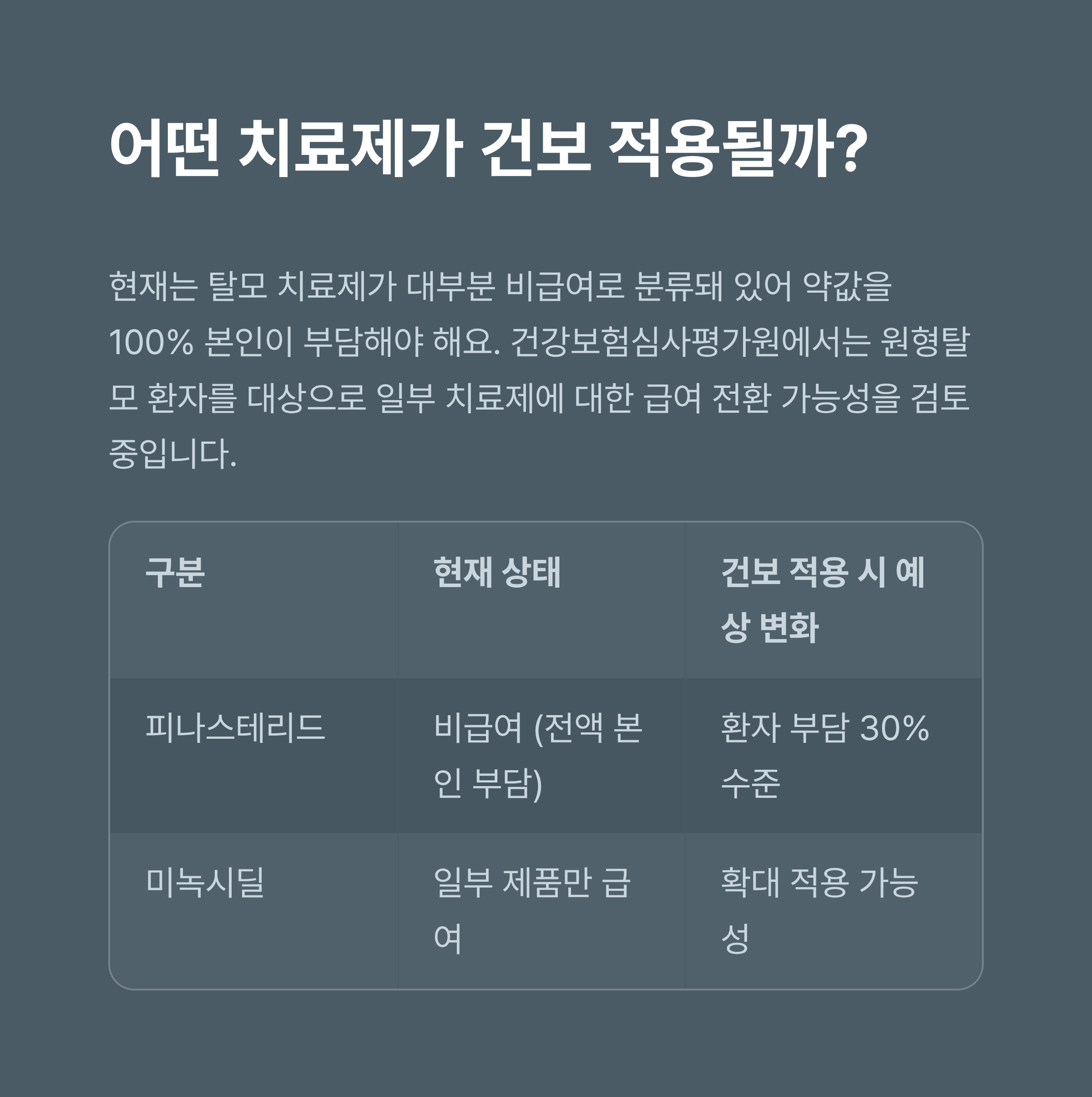 현재는 탈모 치료제가 대부분 비급여로 분류돼 있어 약값을 100% 본인이 부담해야 해요. 그러나 앞으로는 유전성 탈모 치료에 주로 사용되는 피나스테리드, 미녹시딜 등의 약물도 건강보험 적용 대상이 될 수 있다는 기대가 커지고 있어요.