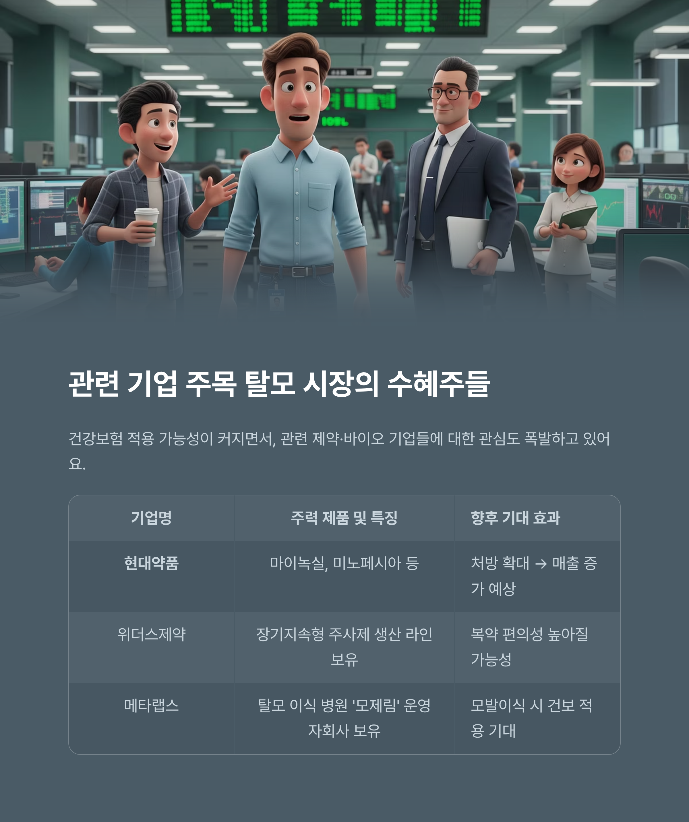 건강보험 적용 가능성이 커지면서, 관련 제약·바이오 기업들에 대한 관심도 폭발하고 있어요. 탈모 치료제를 생산하거나 관련 기술을 보유한 기업들이 주가 상승의 중심에 서고 있습니다.
