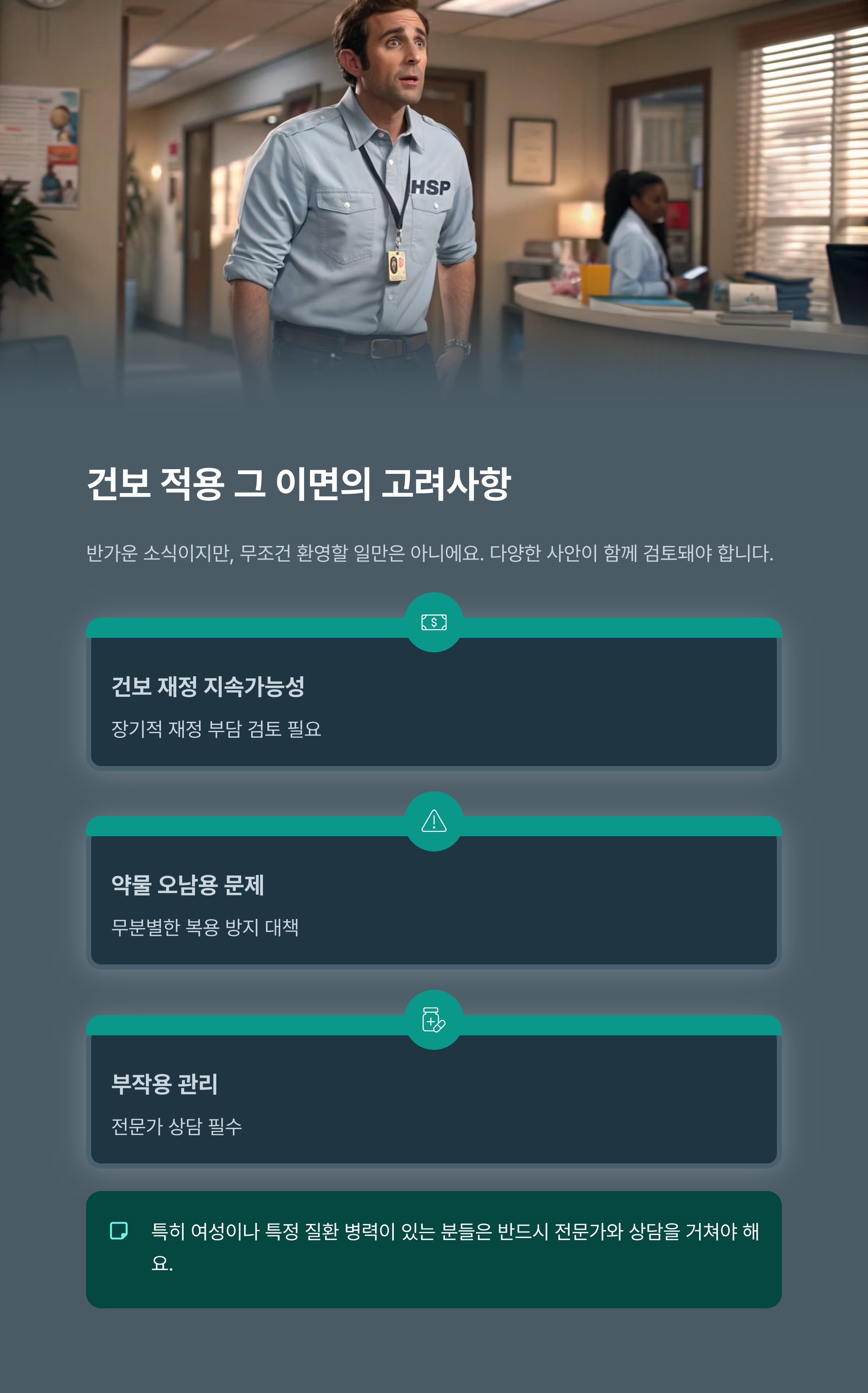 반가운 소식이지만, 무조건 환영할 일만은 아니에요. 건강보험 재정의 지속 가능성, 약물 오남용 문제, 부작용 관리 등 다양한 사안이 함께 검토돼야 합니다.