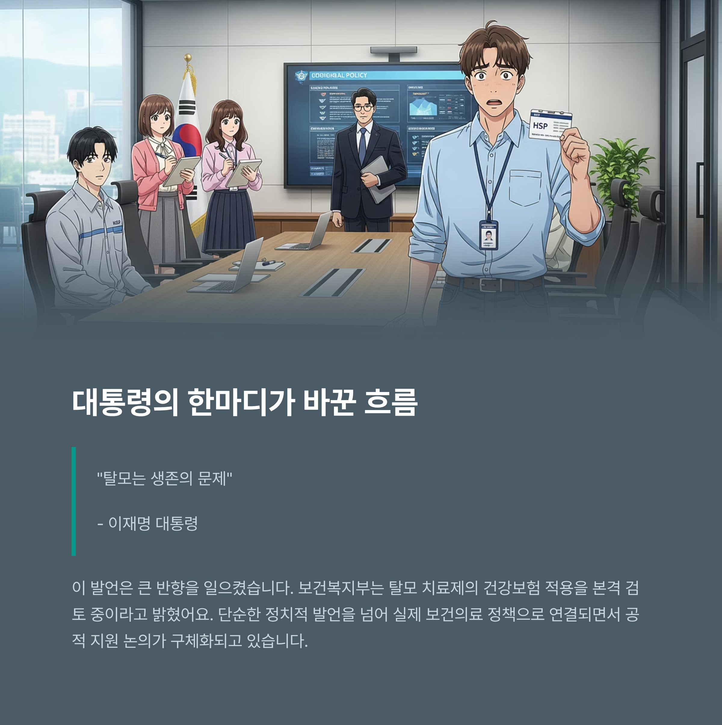 단순한 정치적 발언을 넘어 실제 보건의료 정책으로 연결되면서, 탈모 치료제에 대한 공적 지원 논의가 점점 구체화되고 있어요.