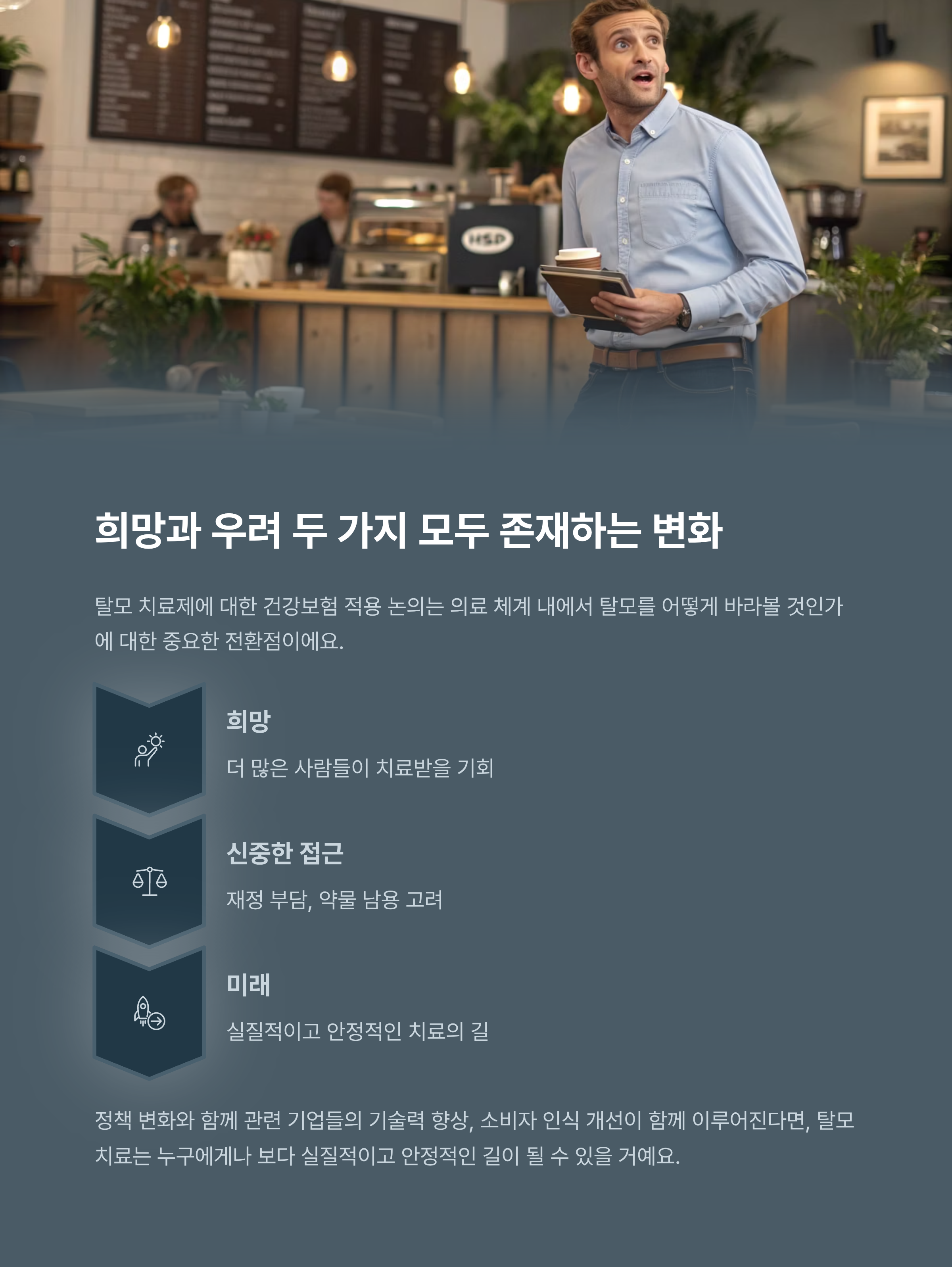 정책 변화와 함께 관련 기업들의 기술력 향상, 소비자 인식 개선이 함께 이루어진다면, 탈모 치료는 누구에게나 보다 실질적이고 안정적인 길이 될 수 있을 거예요.