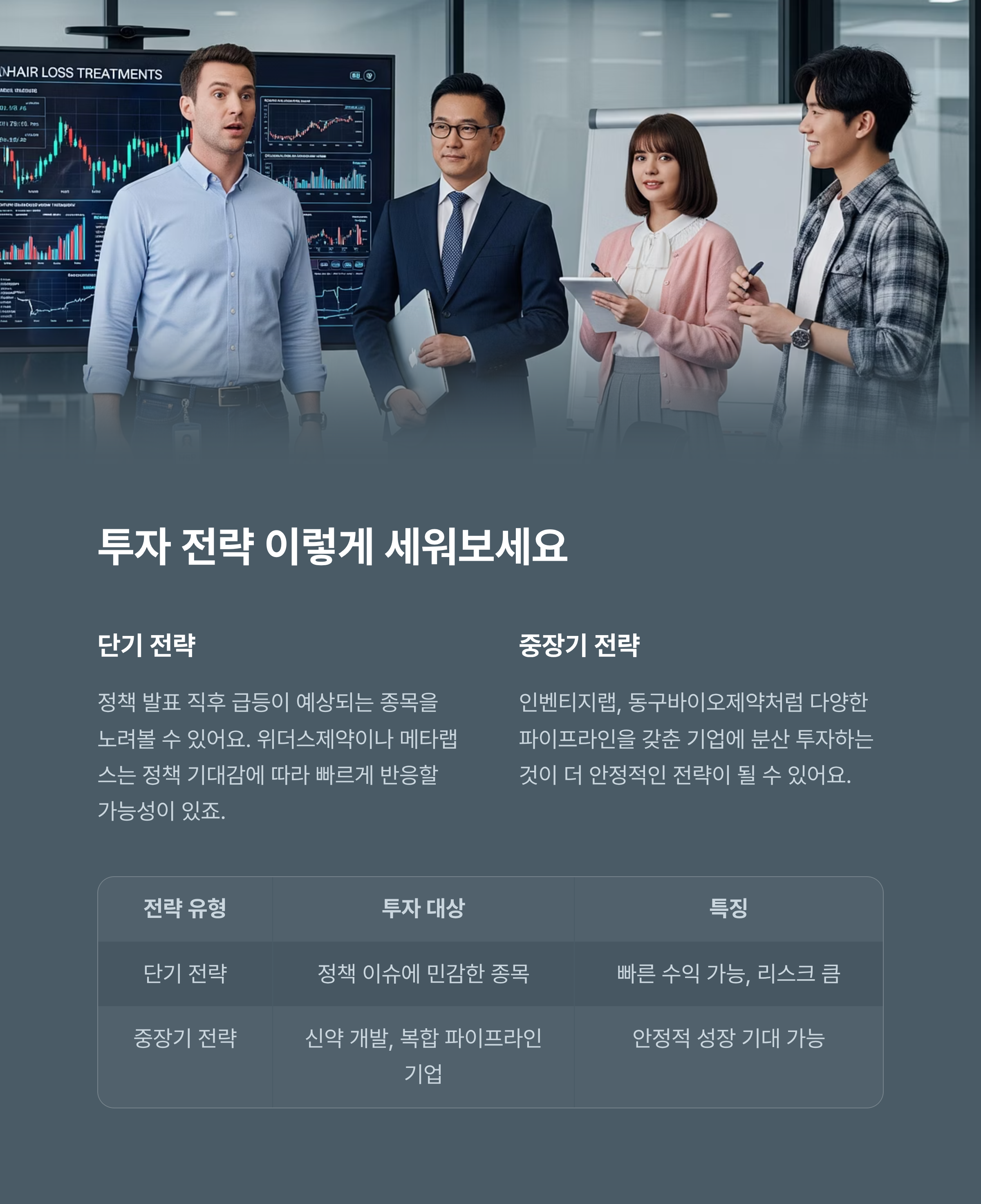 단기적으로는 정책 발표 직후 급등이 예상되는 종목을 노려볼 수 있어요. 예를 들어 위더스제약이나 메타랩스는 정책 기대감에 따라 빠르게 반응할 가능성이 있죠.