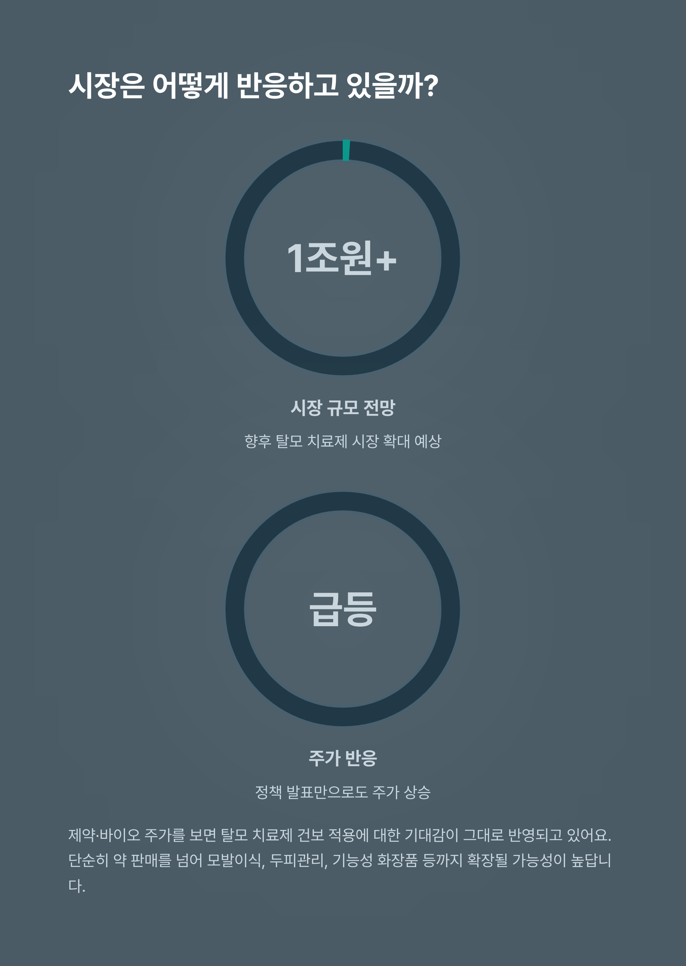 또한 시장조사에 따르면, 탈모 치료제 시장은 향후 1조 원 규모 이상으로 확대될 수 있을 것으로 전망되고 있어요. 단순히 약 판매를 넘어, 모발이식, 두피관리, 기능성 화장품 등까지 확장될 가능성이 높답니다.