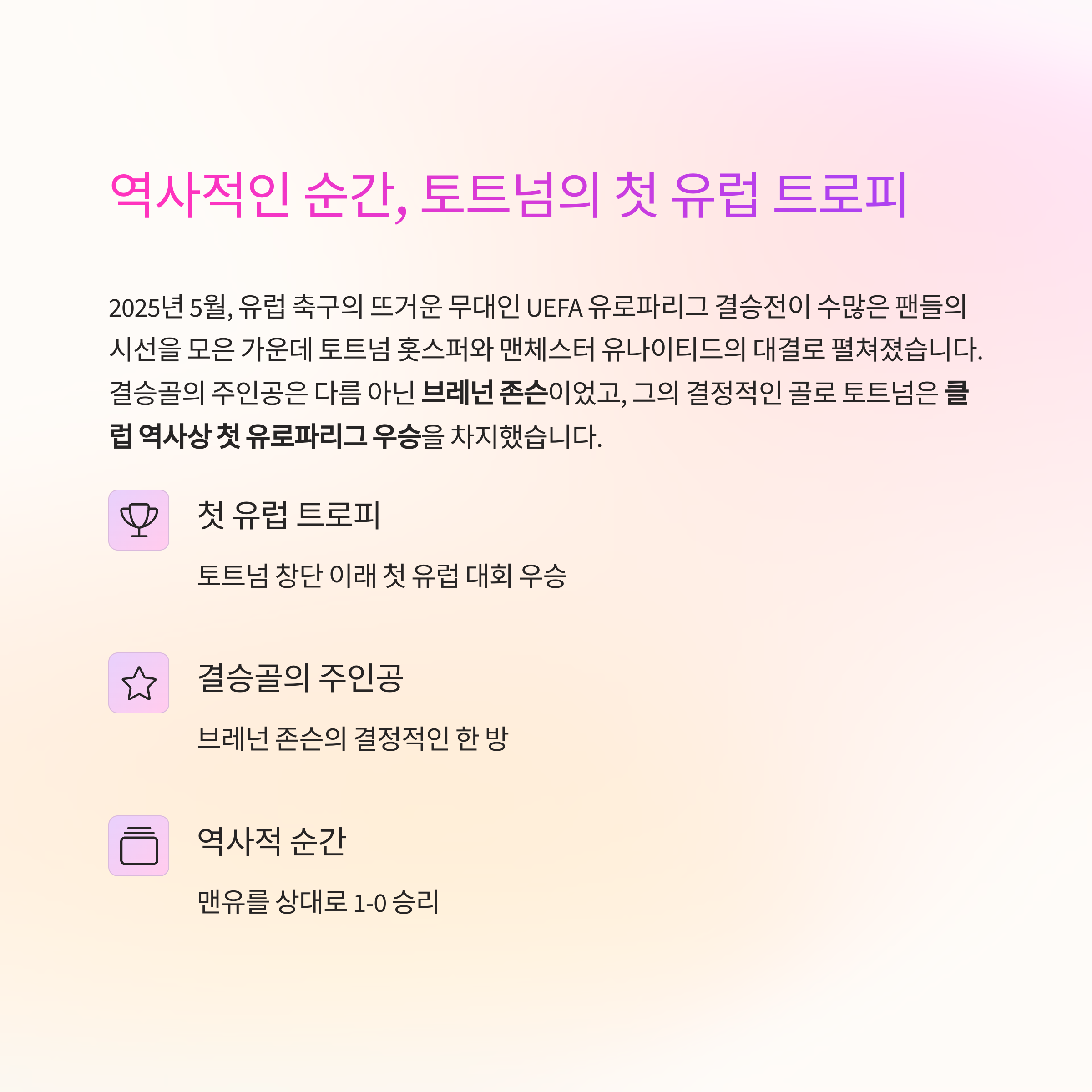 2025 유로파리그 결승, 토트넘이 맨유를 꺾고 창단 첫 유럽 트로피를 들어 올렸습니다