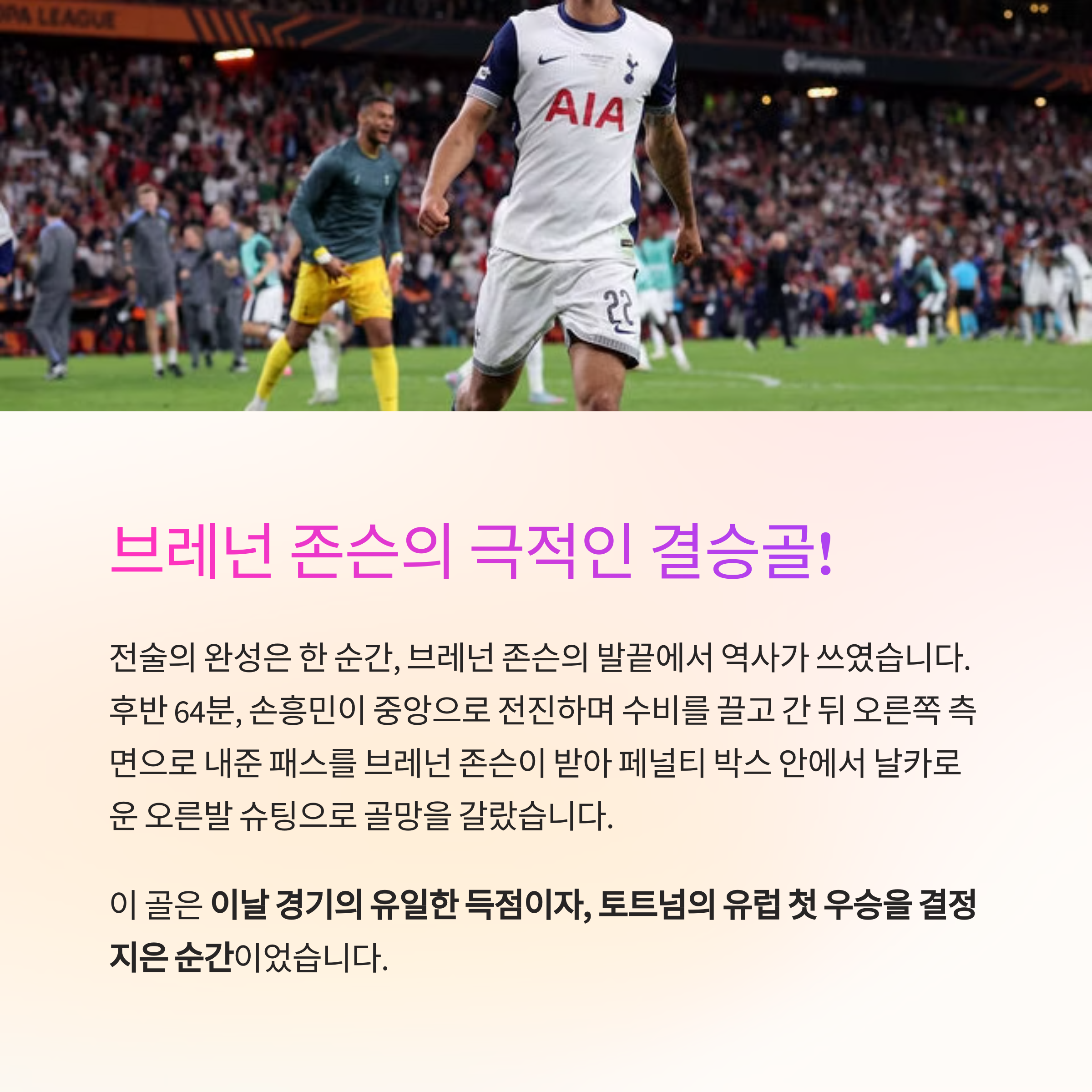 이 골은 이날 경기의 유일한 득점이자, 토트넘의 유럽 첫 우승을 결정지은 순간이었습니다