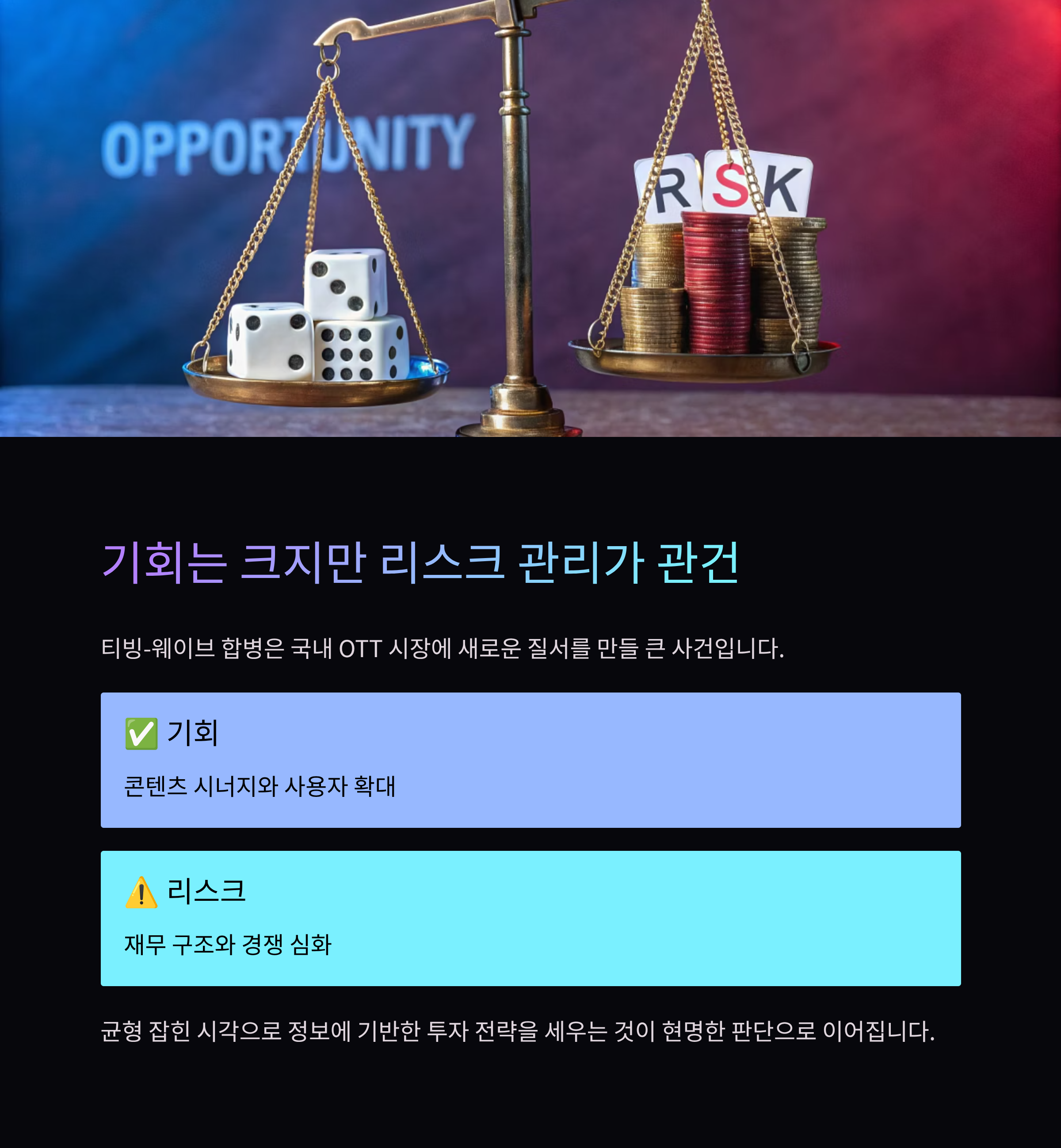 콘텐츠 시너지와 사용자 확대는 분명한 기회지만, 재무 구조나 경쟁 심화 같은 리스크도 놓쳐선 안 됩니다.