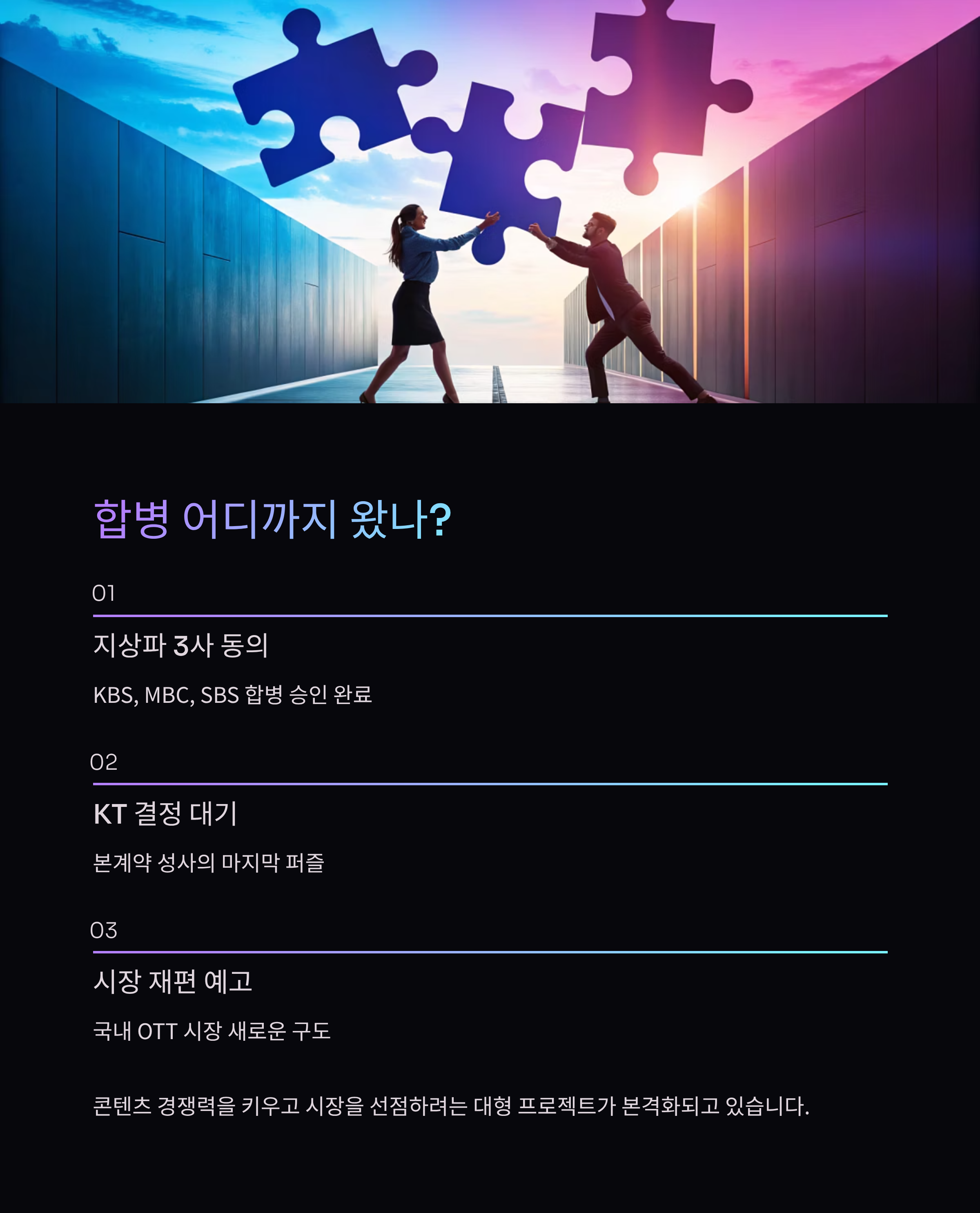 티빙과 웨이브의 합병은 단순한 사업 전략이 아니라, 콘텐츠 경쟁력을 키우고 시장을 선점하려는 대형 프로젝트입니다. 최근 KBS, MBC, SBS 등 지상파 3사가 합병에 동의하면서 본계약 성사를 위한 퍼즐은 거의 맞춰졌습니다. 이제 남은 건 KT의 결정뿐이죠.