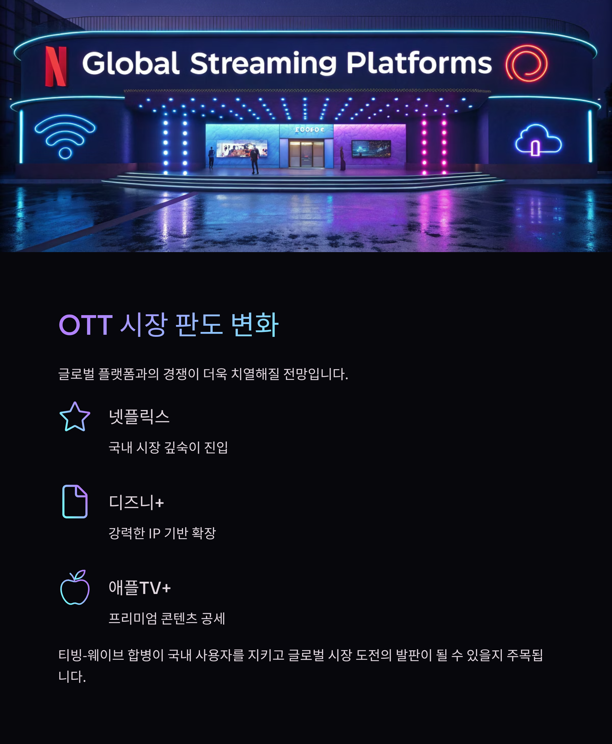 넷플릭스, 디즈니+, 애플TV+ 등 글로벌 플랫폼은 이미 국내 시장에 깊숙이 진입한 상태인데요. 티빙-웨이브 합병이 국내 사용자를 지키고, 나아가 글로벌 시장에 도전하는 발판이 될 수 있을지 주목할 필요가 있습니다.