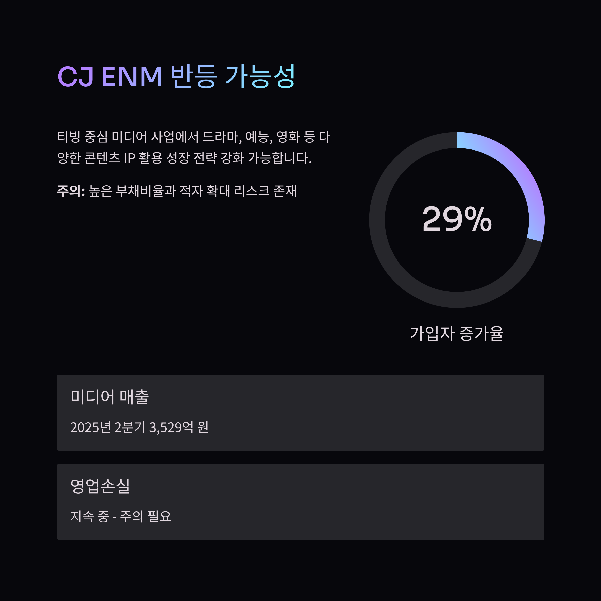 - CJ ENM: 티빙의 최대 주주로서, 콘텐츠 공급 확대와 플랫폼 성장으로 이익 구조가 개선될 가능성