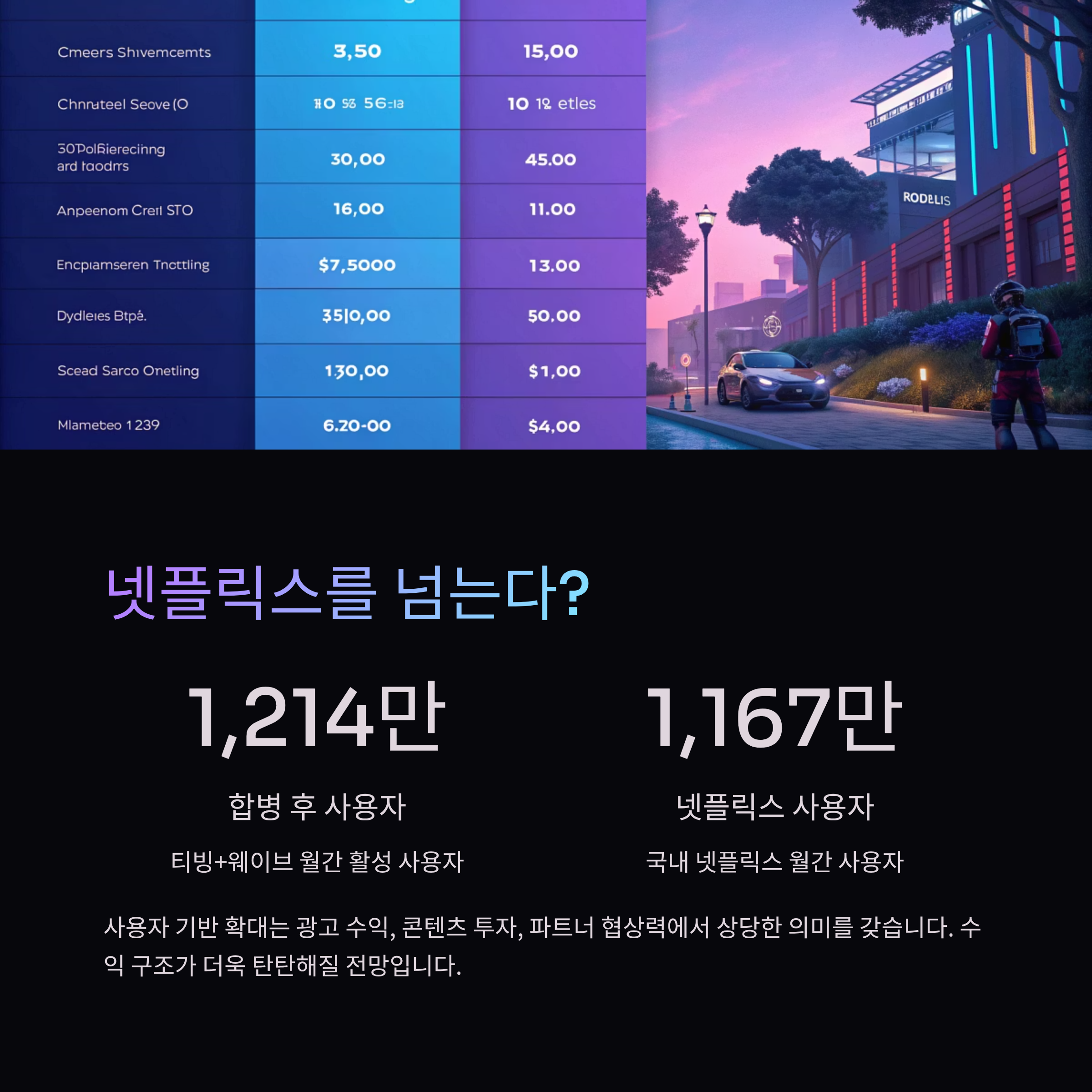 합병이 이루어질 경우 티빙과 웨이브의 월간 활성 사용자 수는 약 1,214만 명으로, 넷플릭스(약 1,167만 명)를 넘어설 수 있습니다.