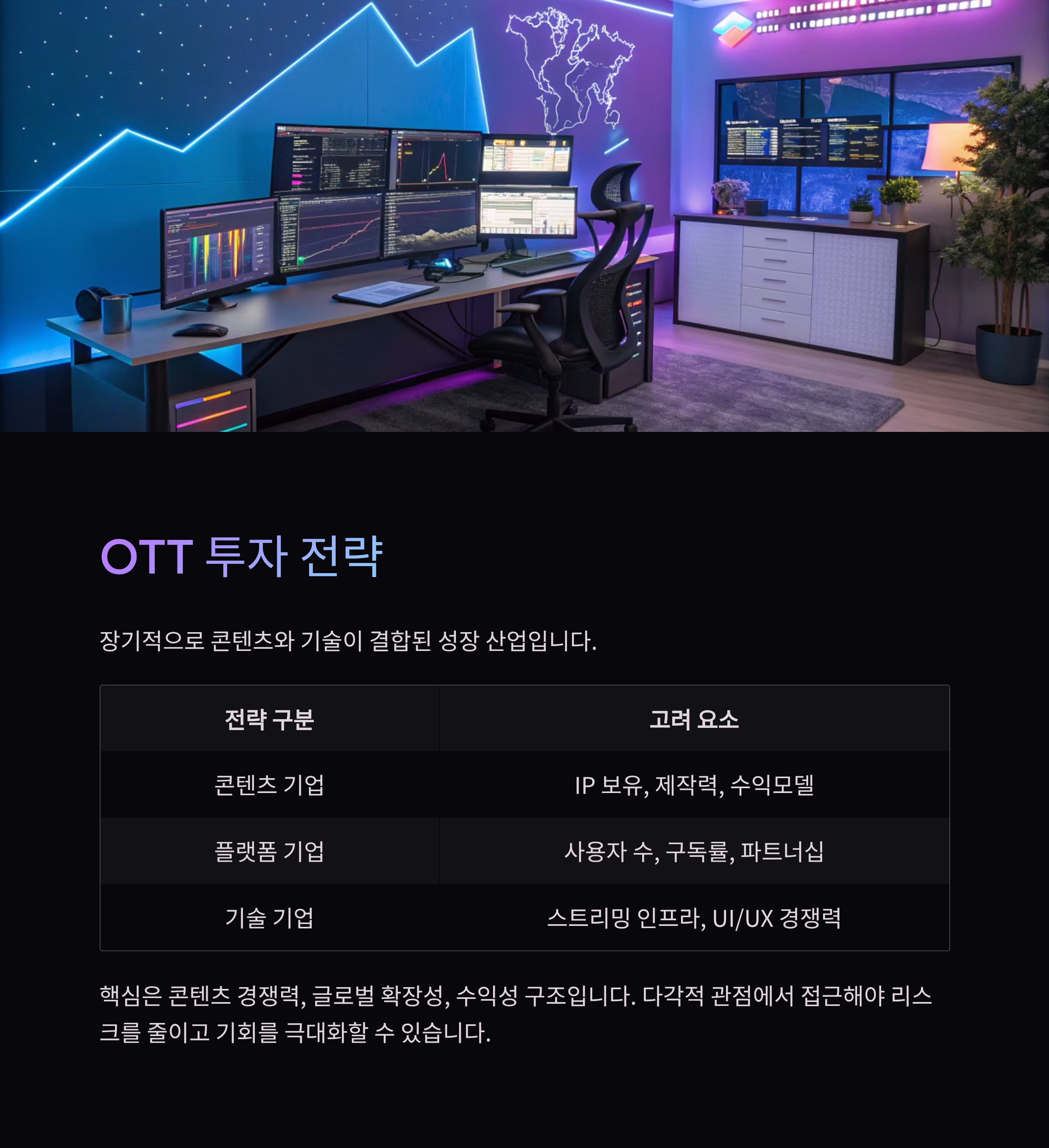 OTT 산업은 장기적으로 콘텐츠와 기술이 결합된 성장 산업입니다. 단기적인 합병 이슈에 따라 주가가 변동하더라도, 핵심은 해당 기업의 콘텐츠 경쟁력, 글로벌 확장성, 수익성 구조에 달려있습니다.